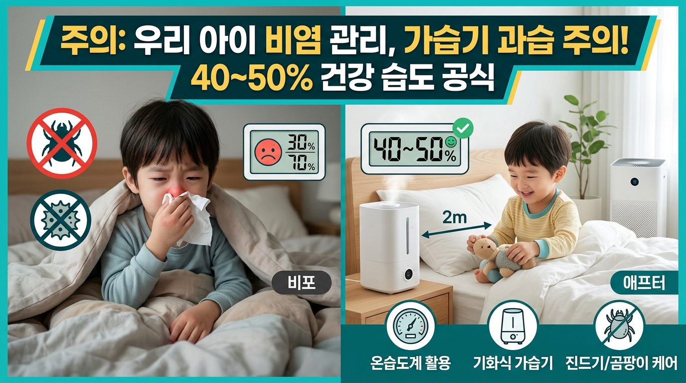 습도가 60%를 넘으면 코 점막이 붓고 진드기가 번식하기 시작합니다. 비염 아이에게 과습은 건조함보다 더 위험할 수 있다는 사실을 꼭 기억하세요!