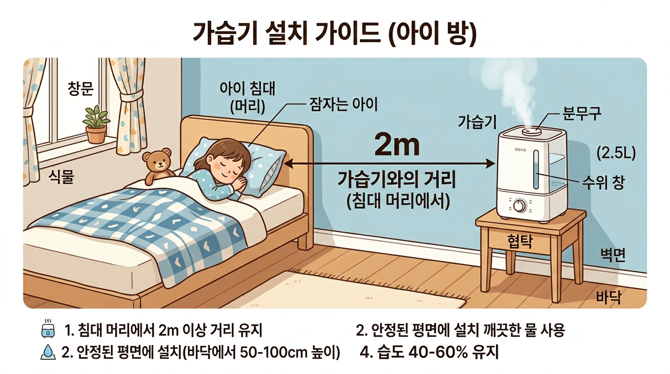 가습기 위치 하나만 바꿔도 아이의 잠자리가 달라집니다. 가습기는 아이의 얼굴에서 최소 1.5m~2m 이상 떨어뜨려 설치하세요. 분무되는 입자가 직접 아이 얼굴에 닿으면 오히려 점막이 차가워져 콧물이 더 날 수 있습니다.