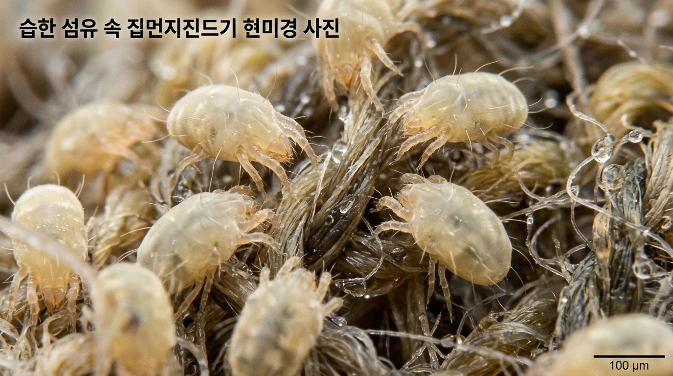 집먼지진드기는 입이 없어서 피부로 수분을 흡수합니다. 주변 공기가 눅눅할수록 수분을 섭취하기 쉬워져 수명이 늘어나고 알을 더 많이 낳게 되죠. 반대로 습도를 45% 이하로만 낮춰도 진드기는 탈수 상태에 빠져 활동이 급격히 줄어듭니다.