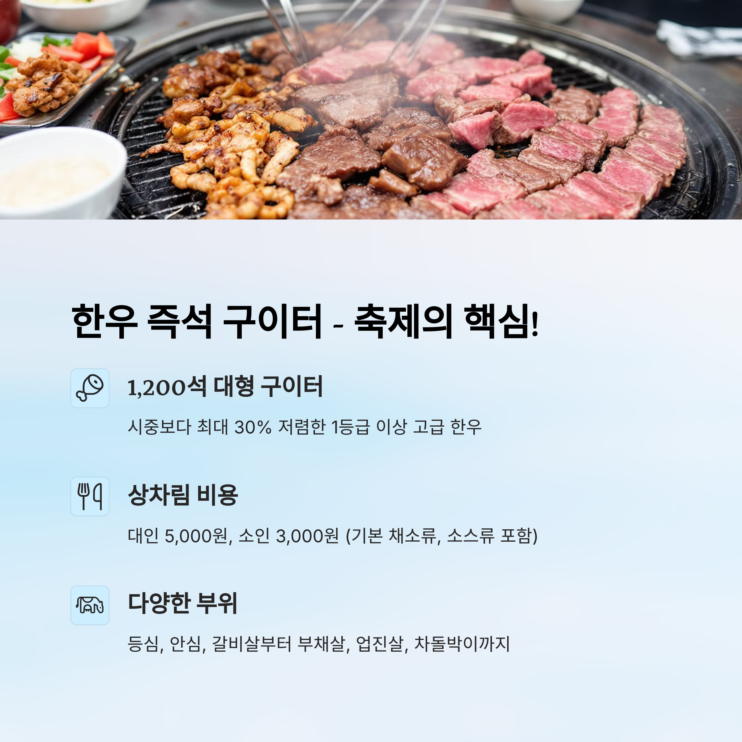 제가 생각했을 때 이 구이터 존은 축제의 핵심 중 핵심이에요. 한우 맛은 물론이고, 가족이나 친구와 둘러앉아 구워 먹는 그 재미와 분위기는 돈 주고도 살 수 없는 경험이니까요! 실제로 작년에도 가장 많은 인파가 몰린 공간이 바로 여기였다고 해요.