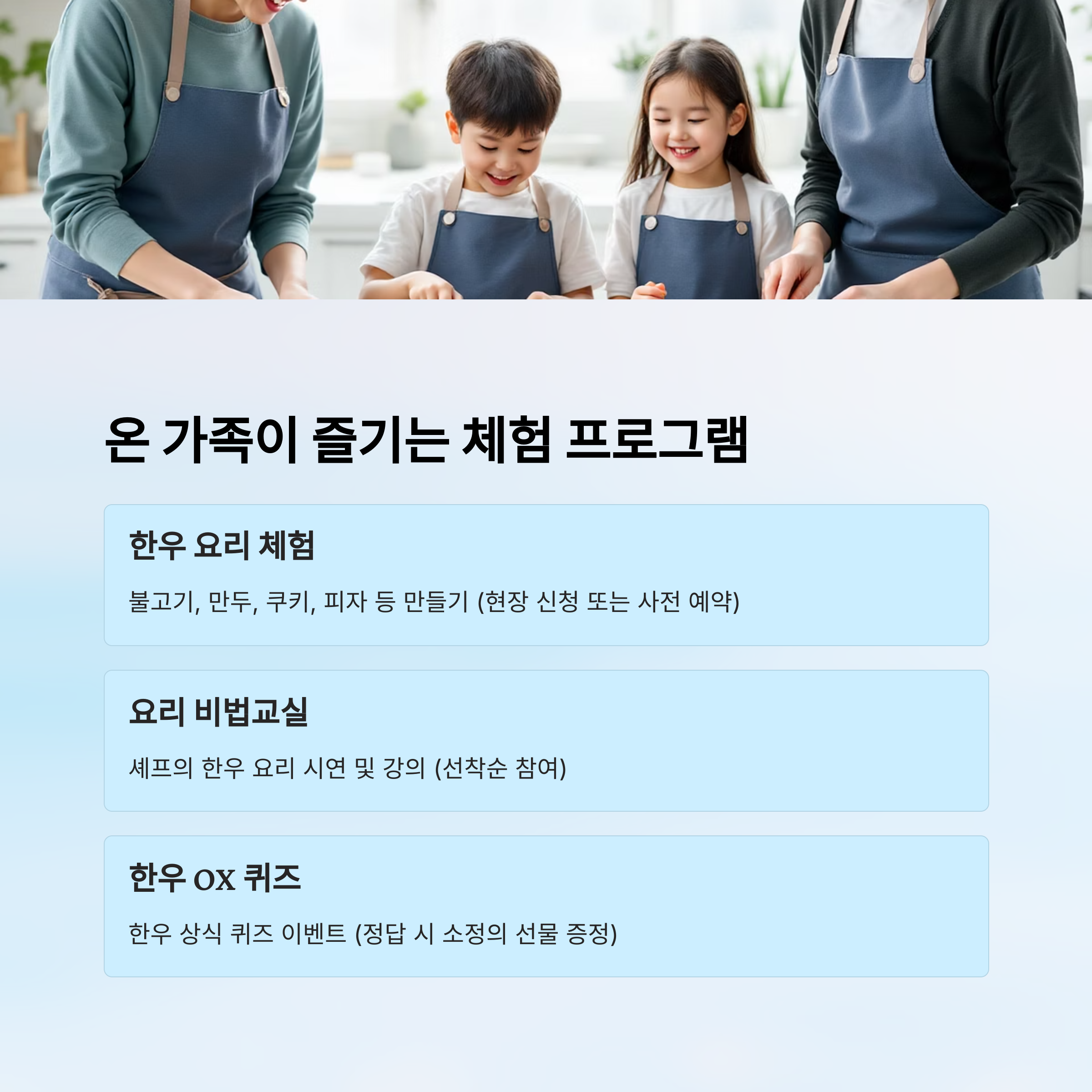 | 한우 요리 체험 | 불고기, 만두, 쿠키, 피자 등 만들기 | 가족, 어린이 | 현장 신청 또는 사전 예약 |