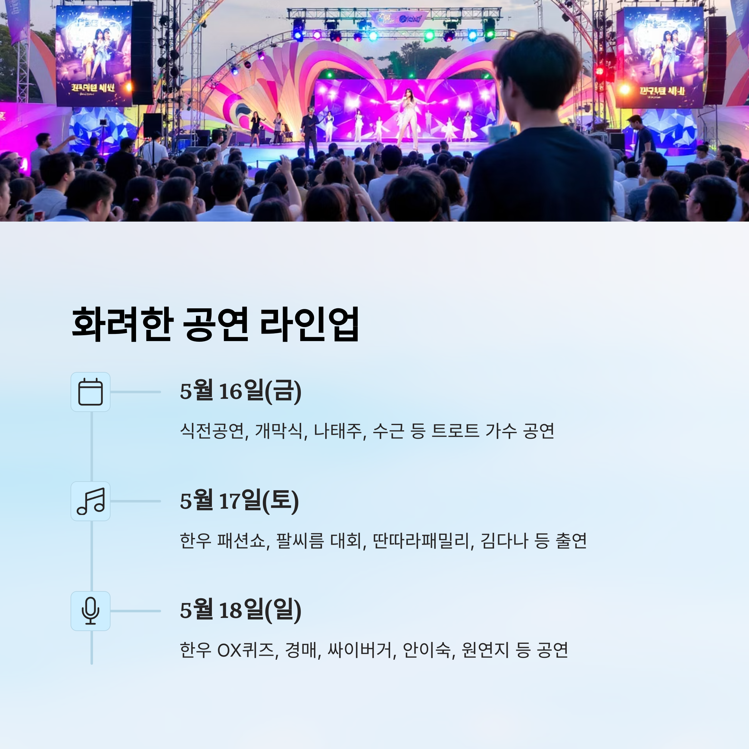 개막일인 5월 16일 금요일에는 오후 6시부터 식전공연이 펼쳐지고, 이어서 나태주, 수근 등 인기 트로트 가수들의 무대가 이어져요. 축제의 문을 여는 만큼 에너지 넘치는 공연이 준비되어 있죠. 식전 무대에는 감미로운 버디킴과 김송이 분위기를 달구고요 🎶