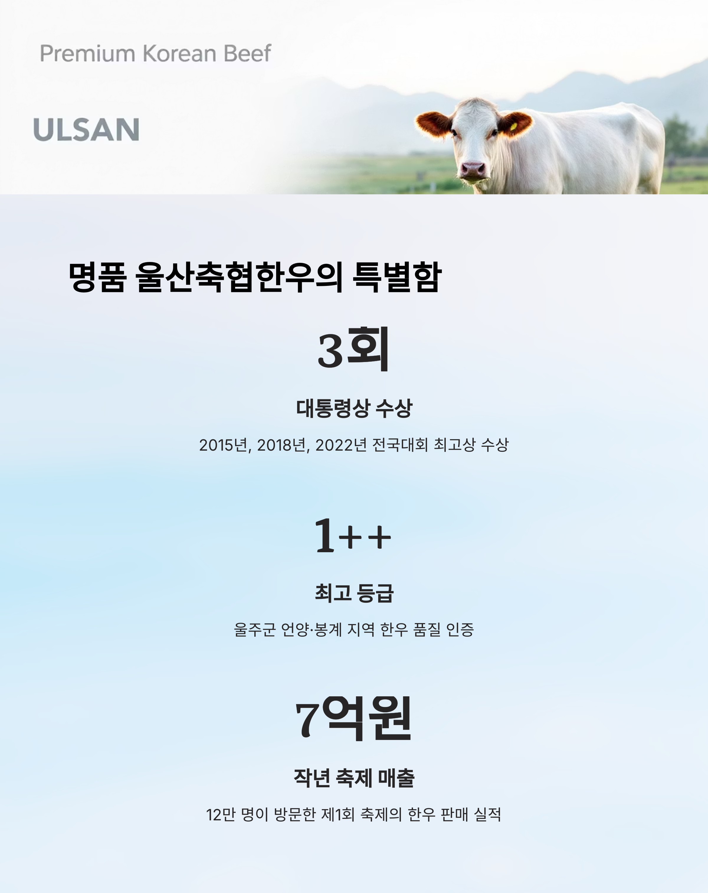 이 브랜드는 단순히 좋은 고기를 판매하는 것에 그치지 않아요. 사육부터 유통, 판매까지 모든 과정에서 지역 조합원이 참여하고, 직접 생산해낸다는 점에서 신뢰와 안전성이 높다는 평가를 받고 있어요. 그래서 전국의 식당이나 정육점에서도 울산축협한우는 ‘믿고 먹는 고기’로 통하죠.