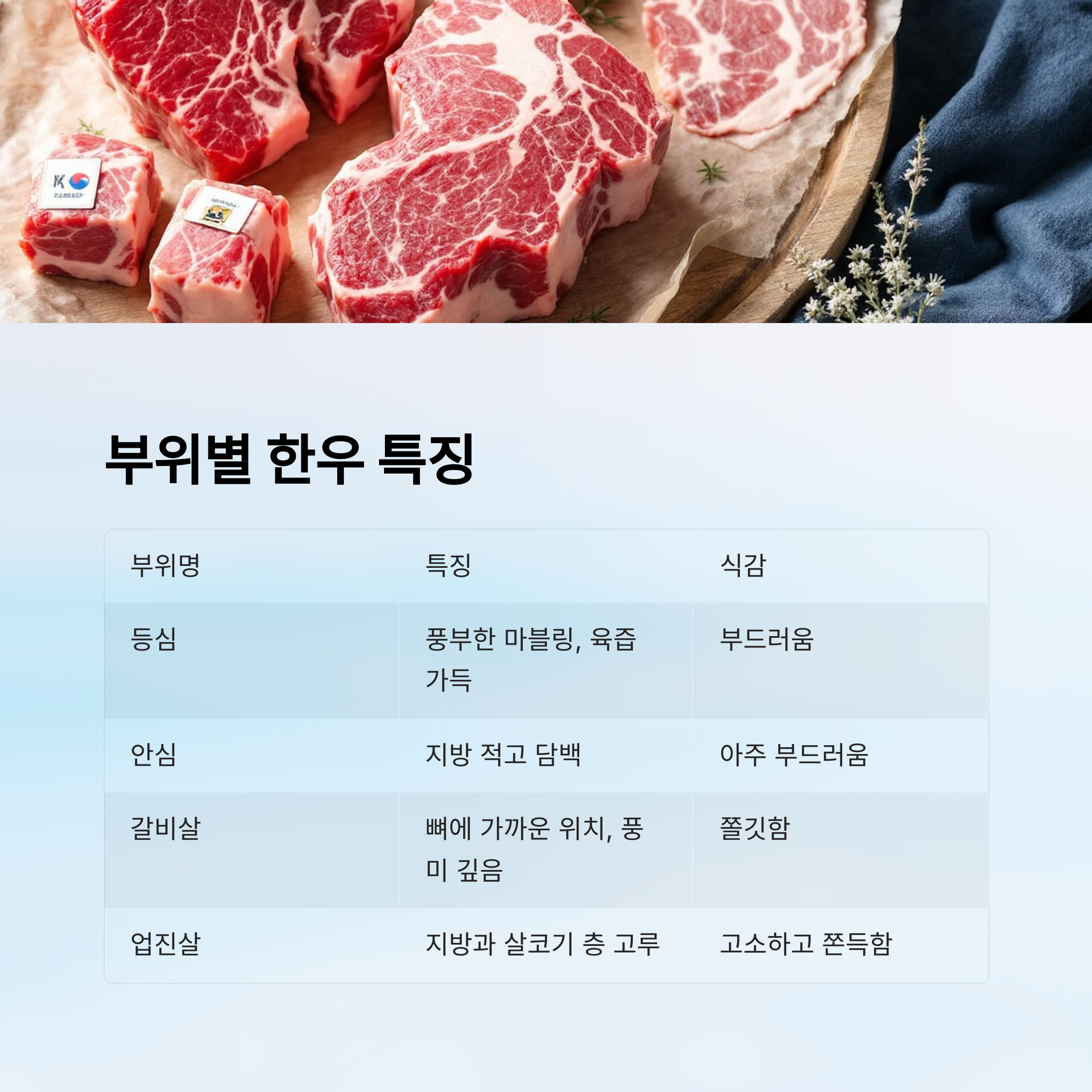 여기서 제공되는 한우는 울산축협 조합원들이 직접 사육한 1등급 이상 고급육으로, 등심, 안심, 갈비살은 물론, 부채살, 업진살, 차돌박이 등 평소 쉽게 접하기 어려운 다양한 특수 부위도 구워볼 수 있답니다. 이 부위들은 각각 고소함, 쫄깃함, 풍부한 육즙 등 색다른 매력을 자랑해요!