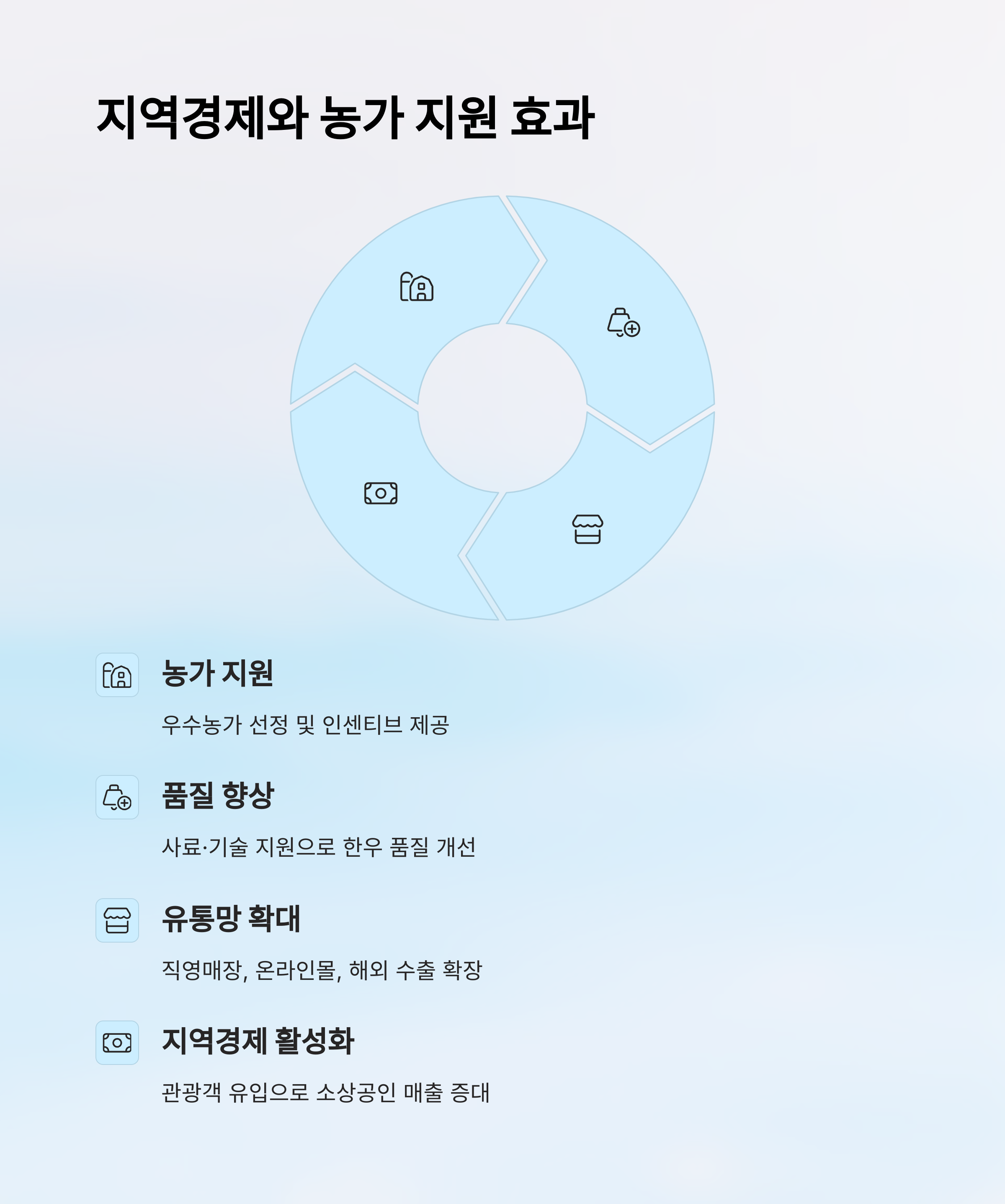 | 사료·기술 지원 | 사료비 보조, 사육 기술 제공 | 전 조합원 | 사육비 절감, 품질 향상 |