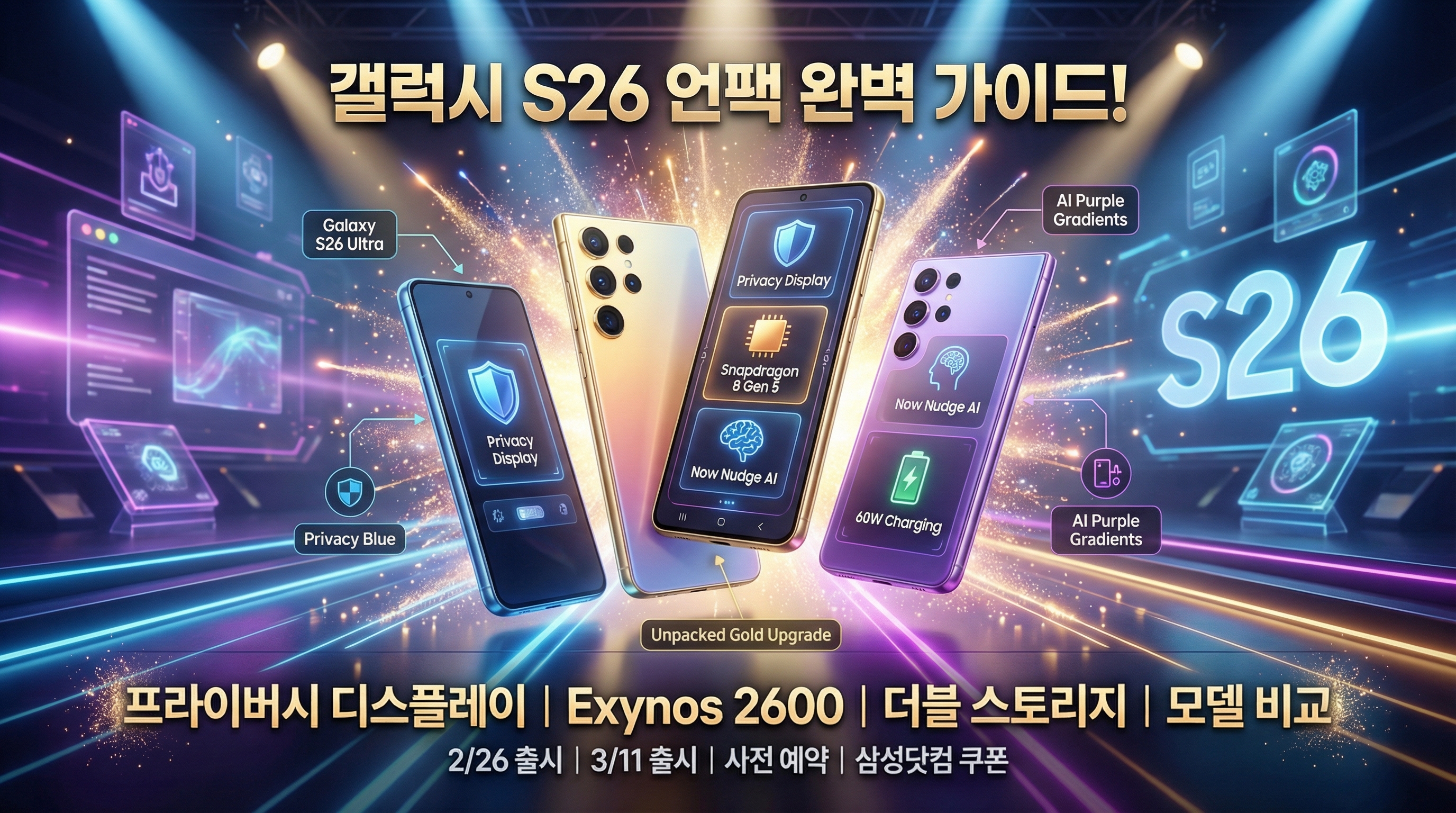 드디어 올 것이 왔네요! 매년 이맘때면 IT 기기 덕후들의 가슴을 뛰게 만드는 삼성의 갤럭시 언팩 행사가 끝났습니다. 이번 갤럭시 S26 시리즈는 "역대급 변화"라는 수식어가 아깝지 않을 만큼 놀라운 기능들이 대거 추가되었는데요. 저도 어제 밤새도록 사양을 뜯어보느라 잠을 설쳤답니다. 😊 특히 울트라 모델에 들어간 '프라이버시 디스플레이' 기술은 정말 무릎을 탁 치게 만들더라고요. 스마트폰 교체 시기를 고민 중이신 분들을 위해, 제가 꼼꼼하게 분석한 핵심 정보들을 지금부터 공유해 드릴게요!