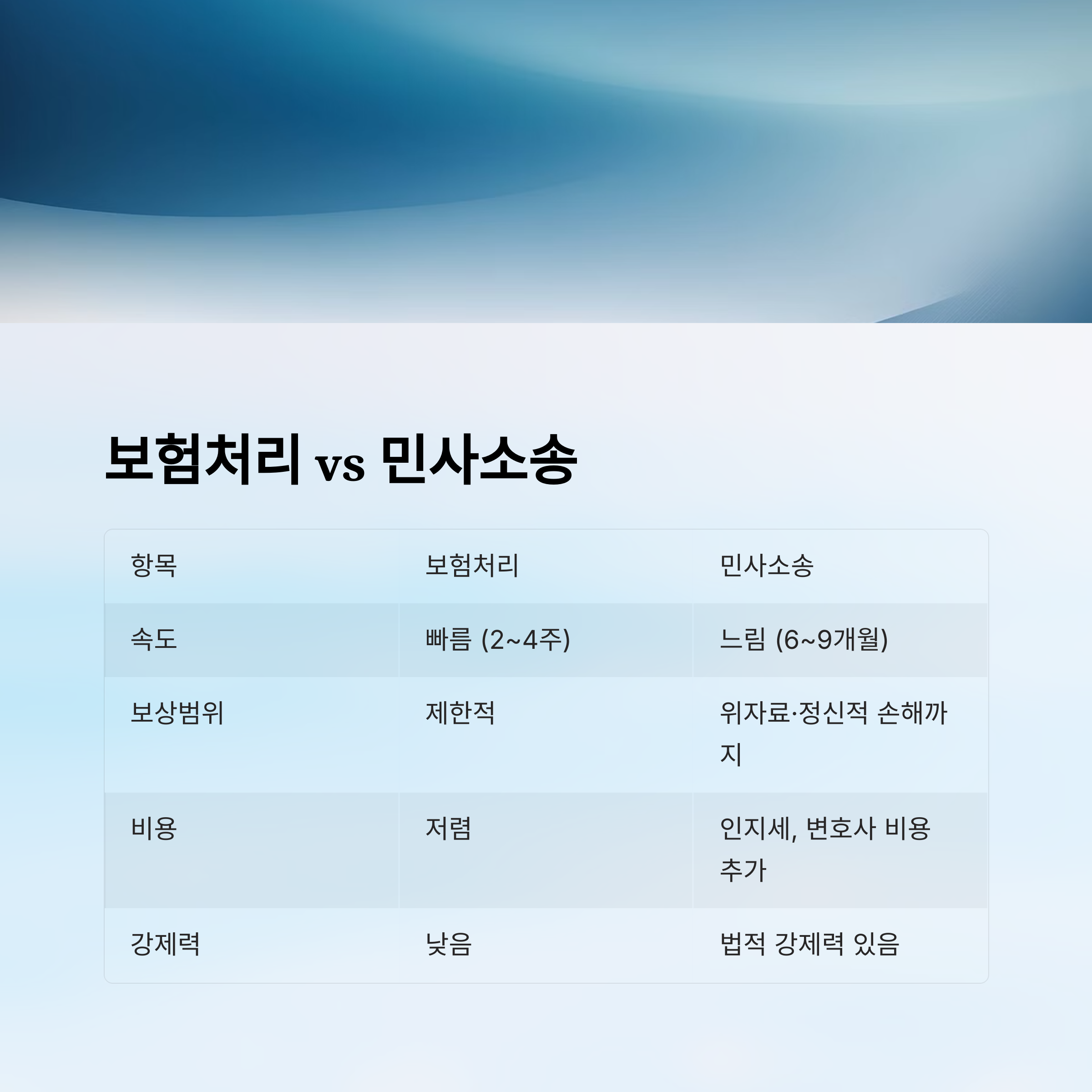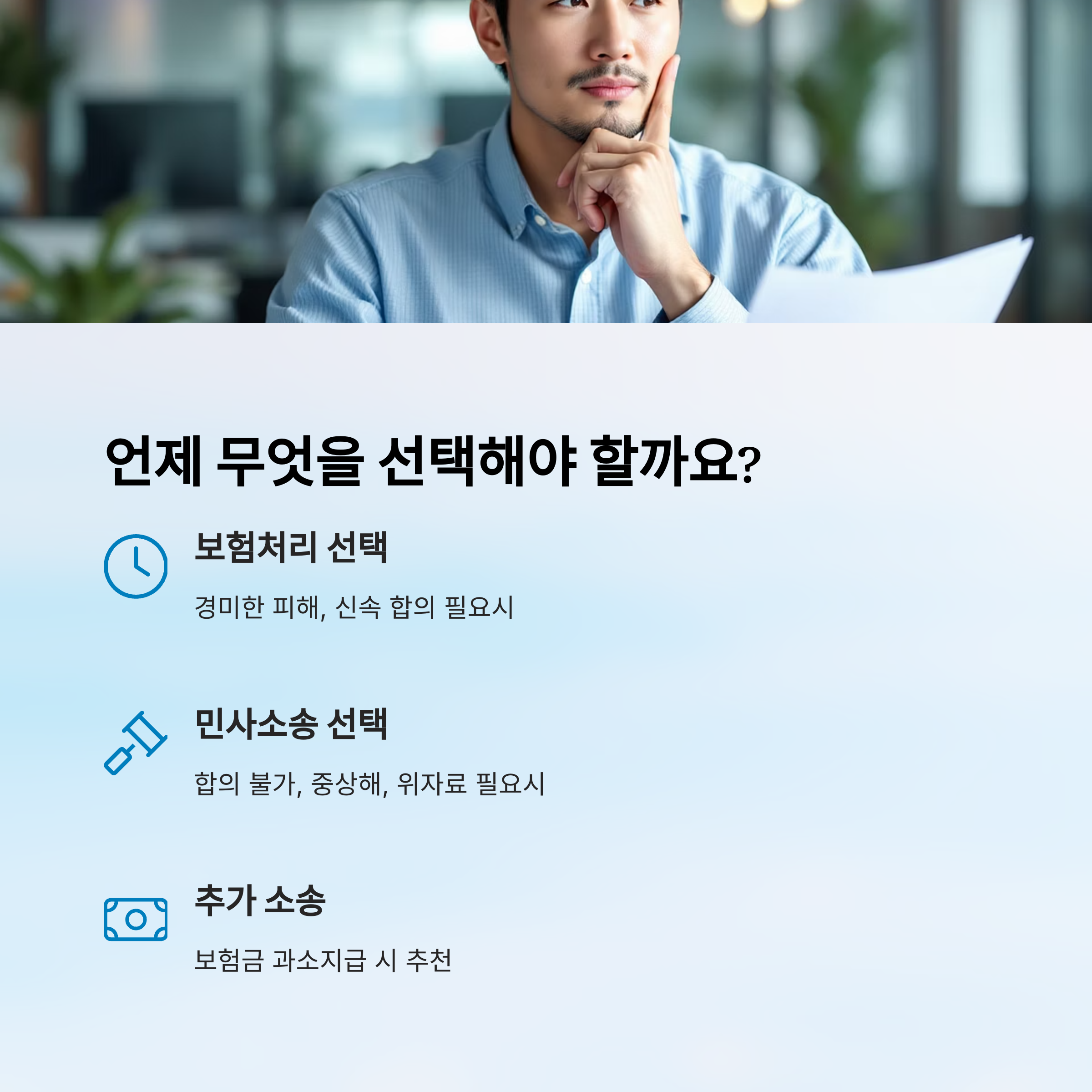 간단한 사고나 경미한 손해는 보험처리로 마무리하는 게 이득이에요. 반면 장기 치료, 중상해, 사망 등 중대한 사건이라면 반드시 민사소송까지 고려해야 해요. 놓치면 큰 손해를 입을 수 있거든요.
