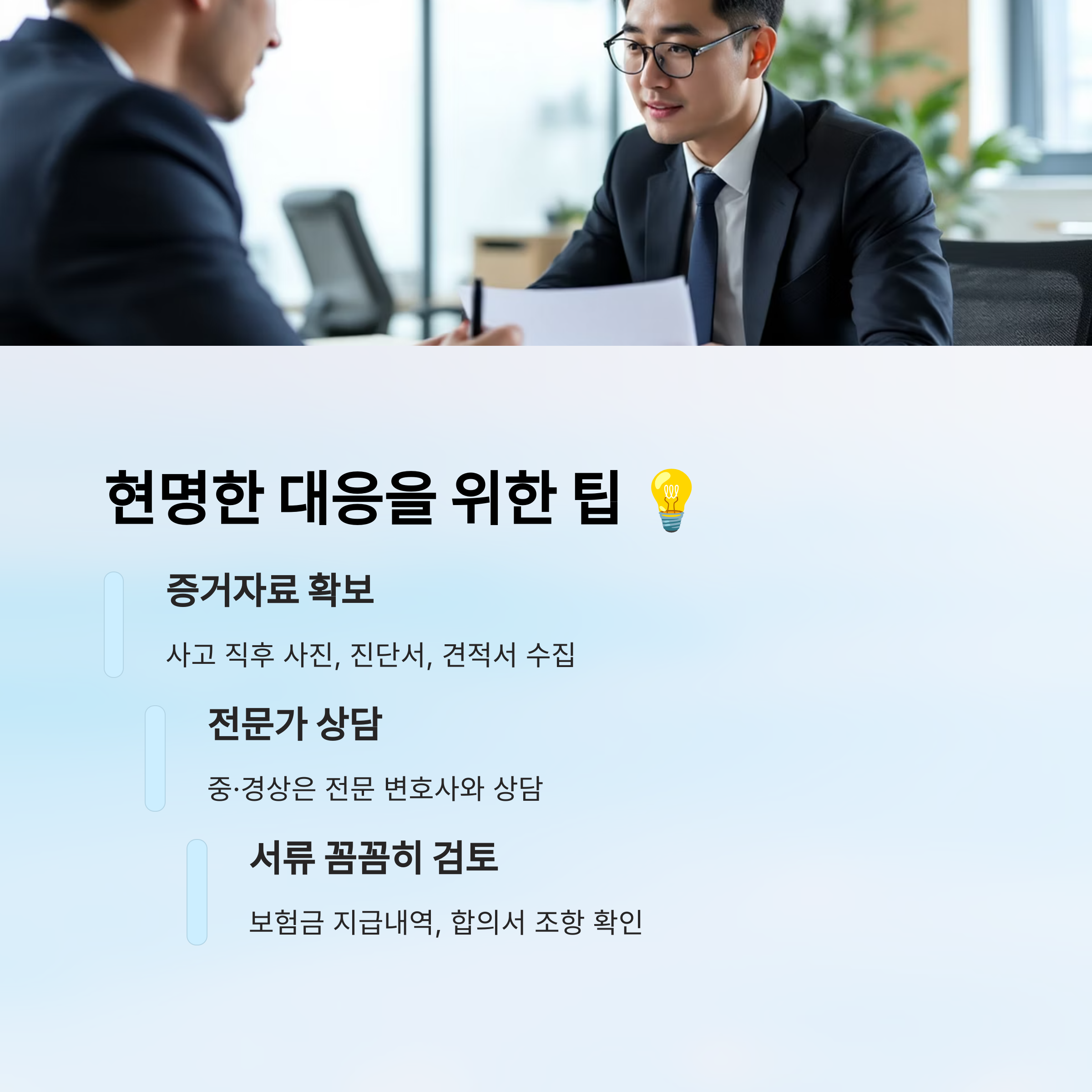 두 번째는 '절대 혼자 판단하지 말기'예요. 보험사가 제안한 보상안이 합리적인지, 법적 문제는 없는지 반드시 전문가의 검토를 받는 것이 좋아요. 무료 상담만으로도 큰 도움을 받을 수 있어요.