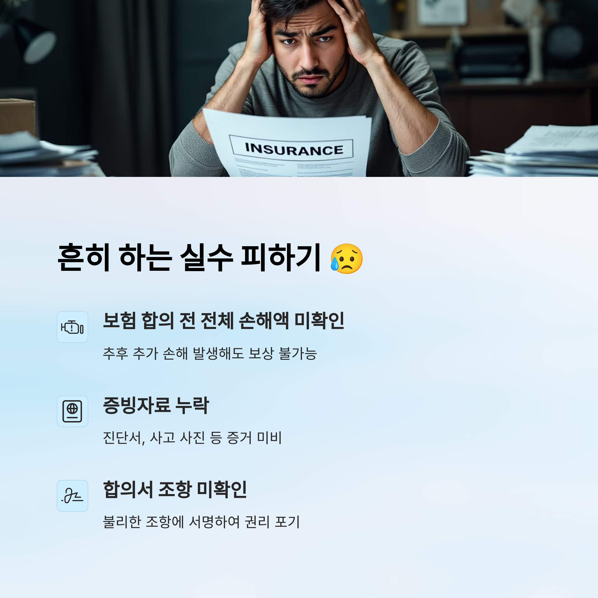 두 번째는 '합의금을 너무 빨리 수락하는 것'이에요. 합의서에 서명하면 이후에 추가 청구가 불가능해지기 때문에, 치료가 완료되기 전까지는 신중해야 해요. 특히 후유증이 남을 수 있는 사고라면, 시간 여유를 두고 판단하는 게 좋아요.