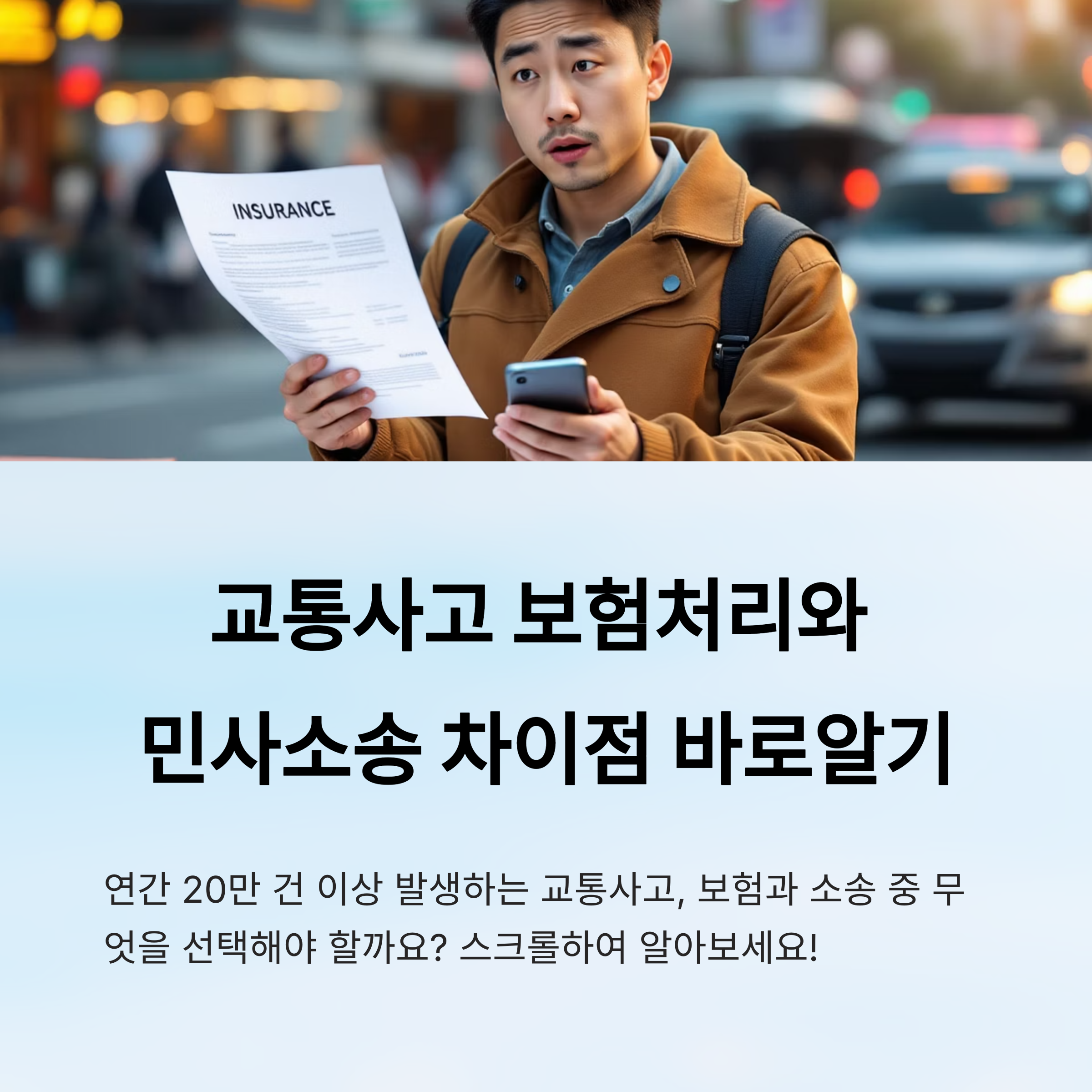 이번 글에서는 교통사고가 났을 때 '보험처리'와 '민사소송' 사이의 차이를 속 시원하게 정리해볼게요. 둘 다 알아야 손해 없이 내 권리를 제대로 지킬 수 있답니다!