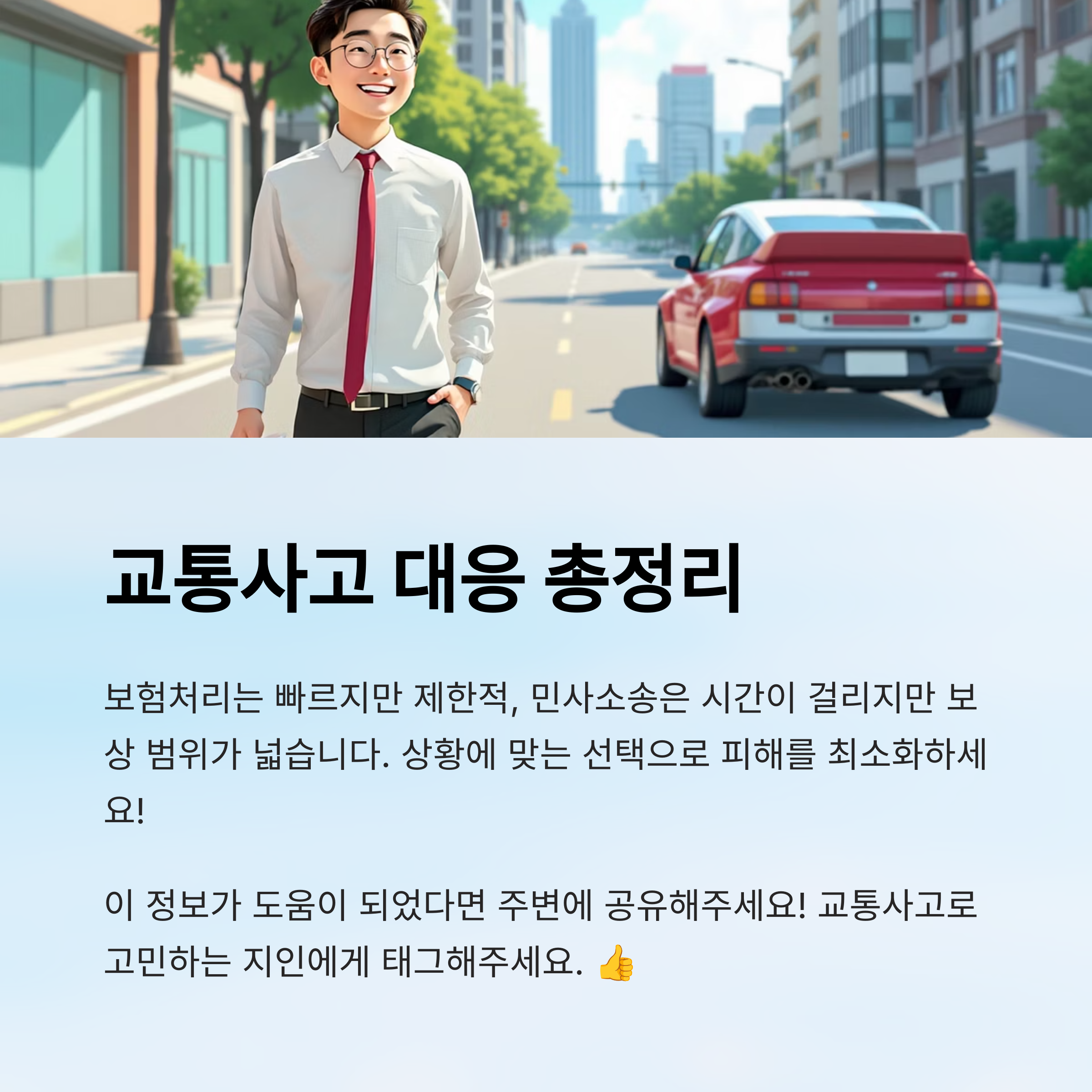 사고 후 무엇보다 중요한 건 '정확한 판단'이에요. 감정에 휘둘리기보다는 냉정하게 손해 규모와 상황을 분석해서 대응하는 게 좋아요. 그리고 혼자 결정하기 어렵다면 전문가 도움 받는 걸 두려워하지 말아야 해요!