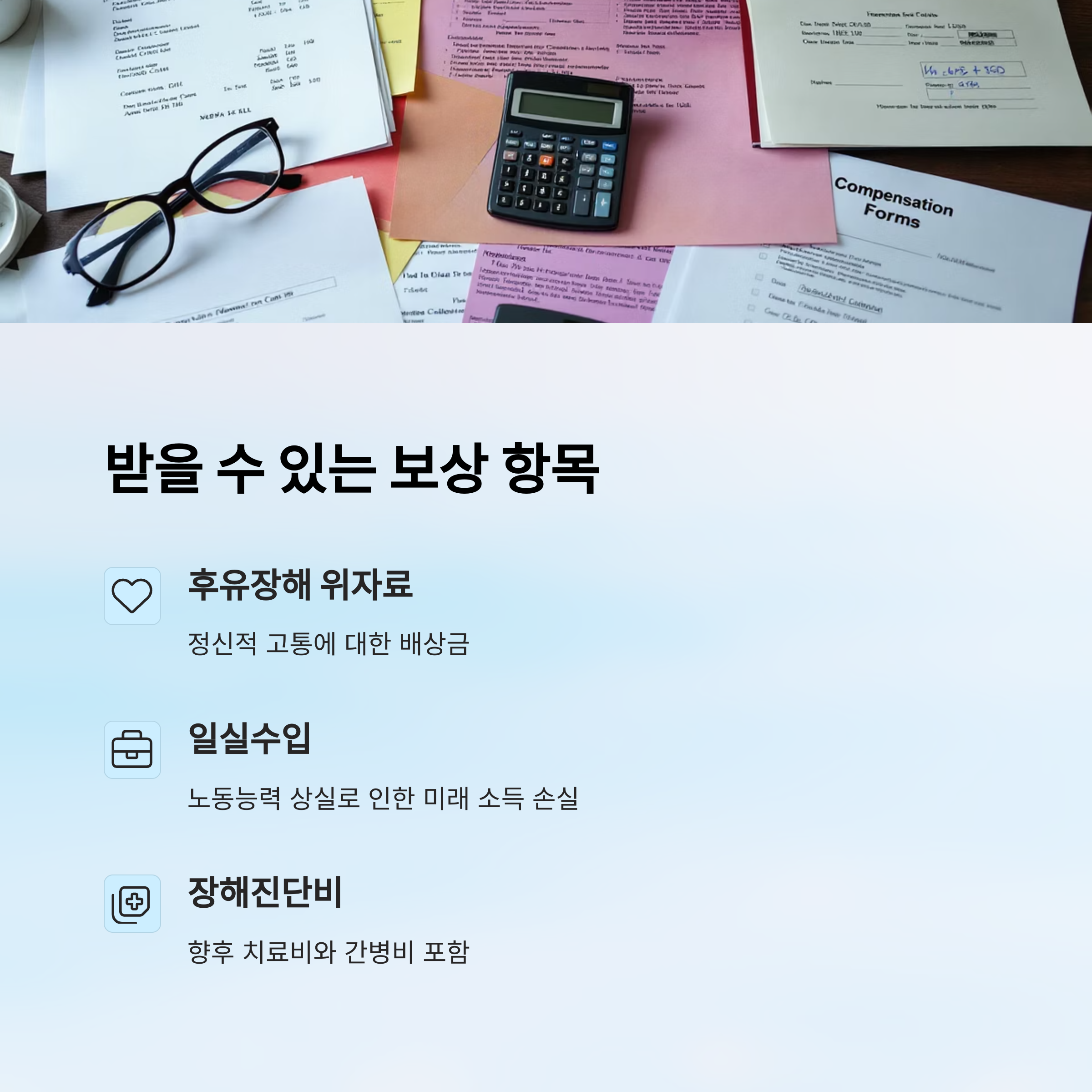 가장 대표적인 건 '일실수입'이에요. 앞에서 설명했듯이, 노동능력 상실로 인해 향후 벌지 못하는 소득을 보전해주는 보상이죠. 후유장해의 핵심 항목이기도 해요.