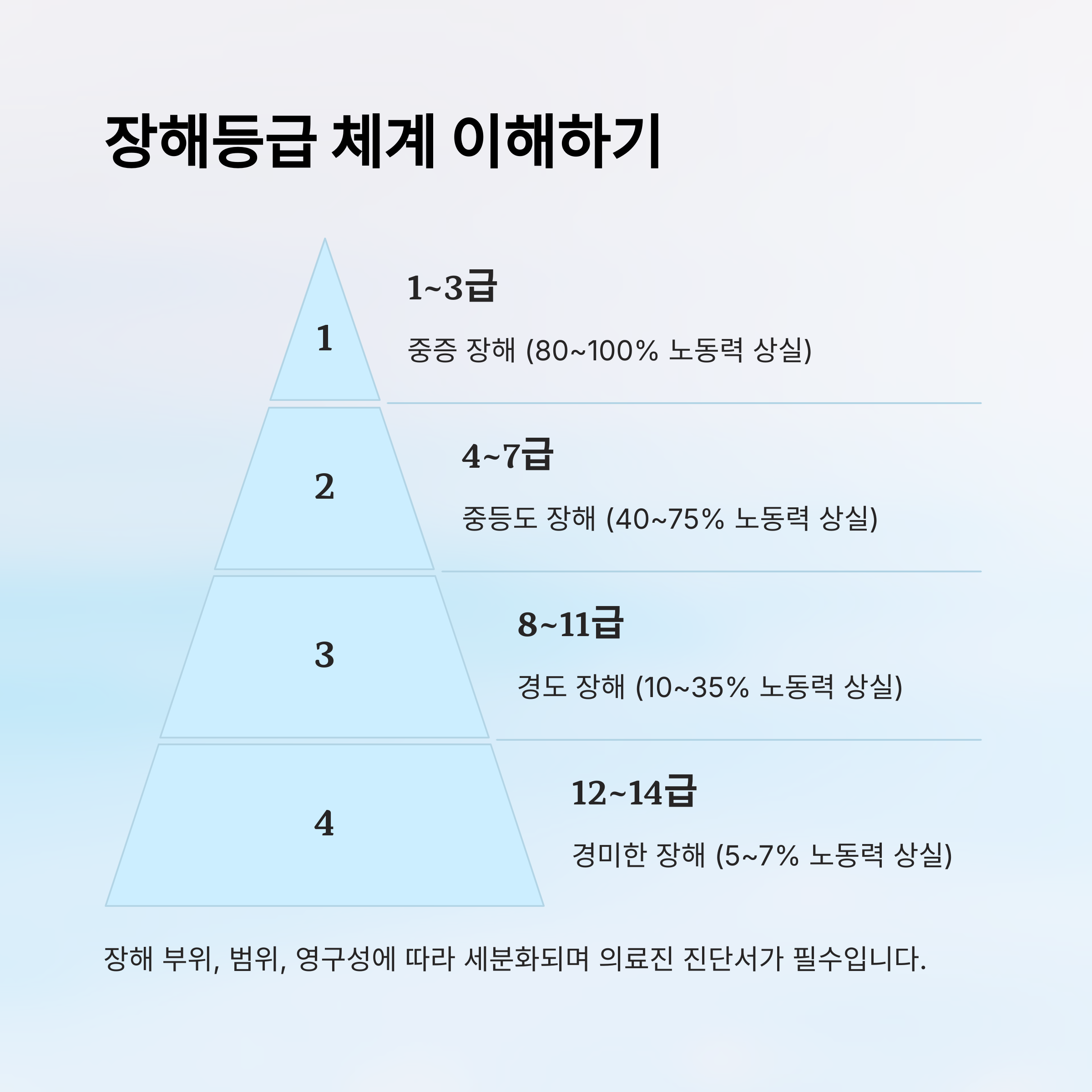 등급은 총 14등급으로 나뉘는데, 1급이 가장 중증이에요. 예를 들어 사지 마비는 1급, 한쪽 손가락을 움직이지 못하는 정도는 12~14급 정도로 평가돼요. 이 등급은 단순히 증상의 유무가 아니라, 얼마나 노동 능력과 생활 기능에 영향을 주는지를 따져서 정해요.