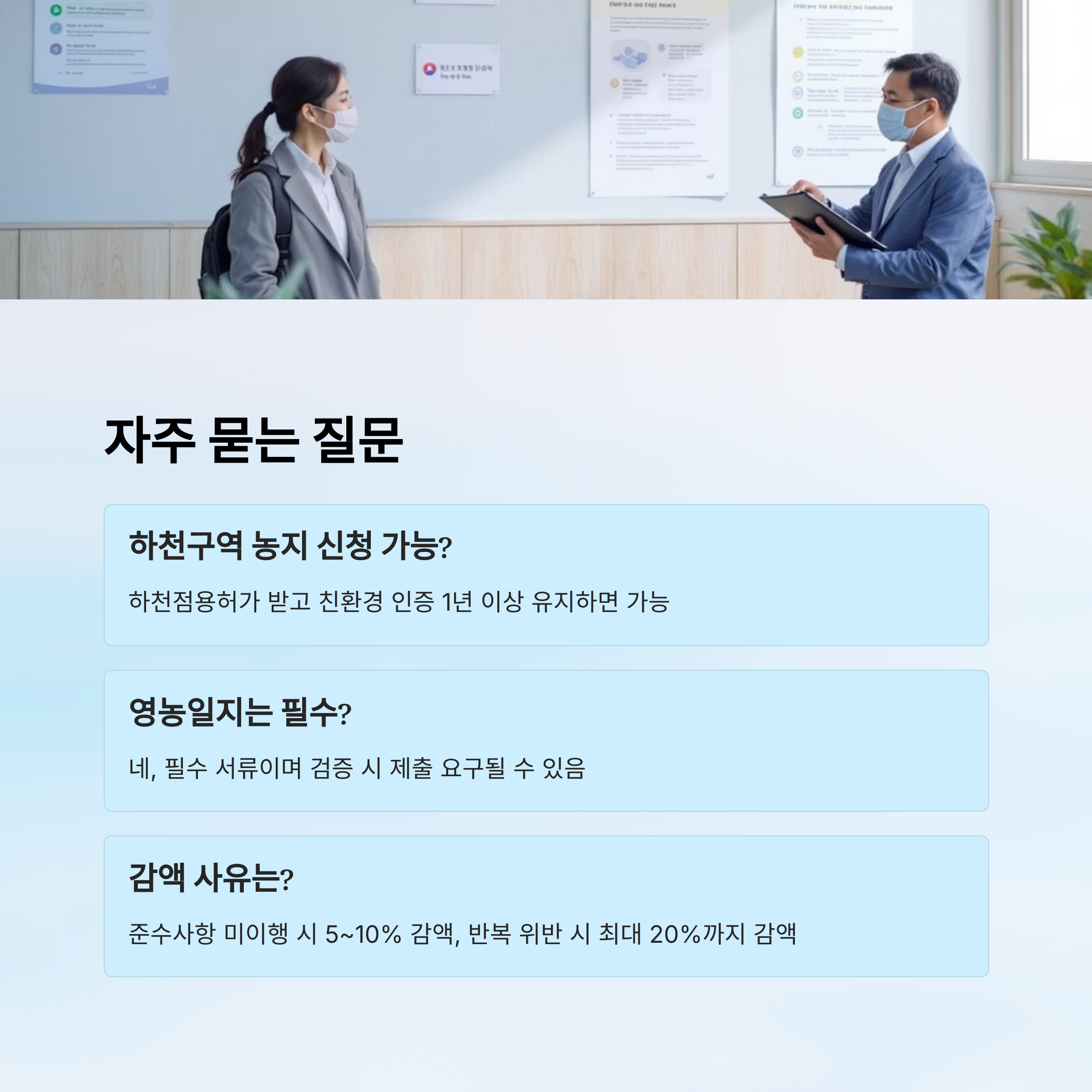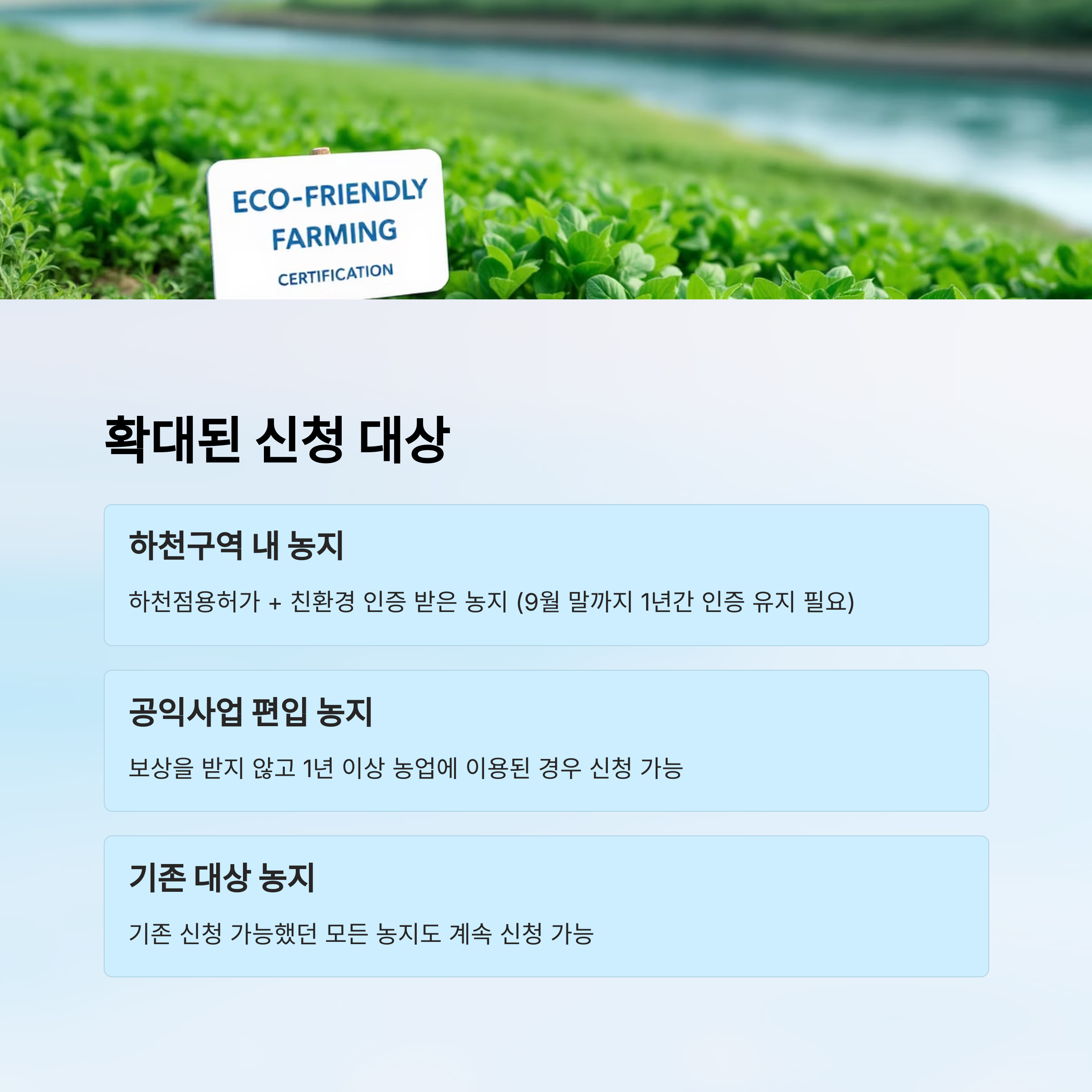 | 하천구역 내 농지 | 하천점용허가 + 친환경 인증 | 9월 말까지 1년간 유지 |