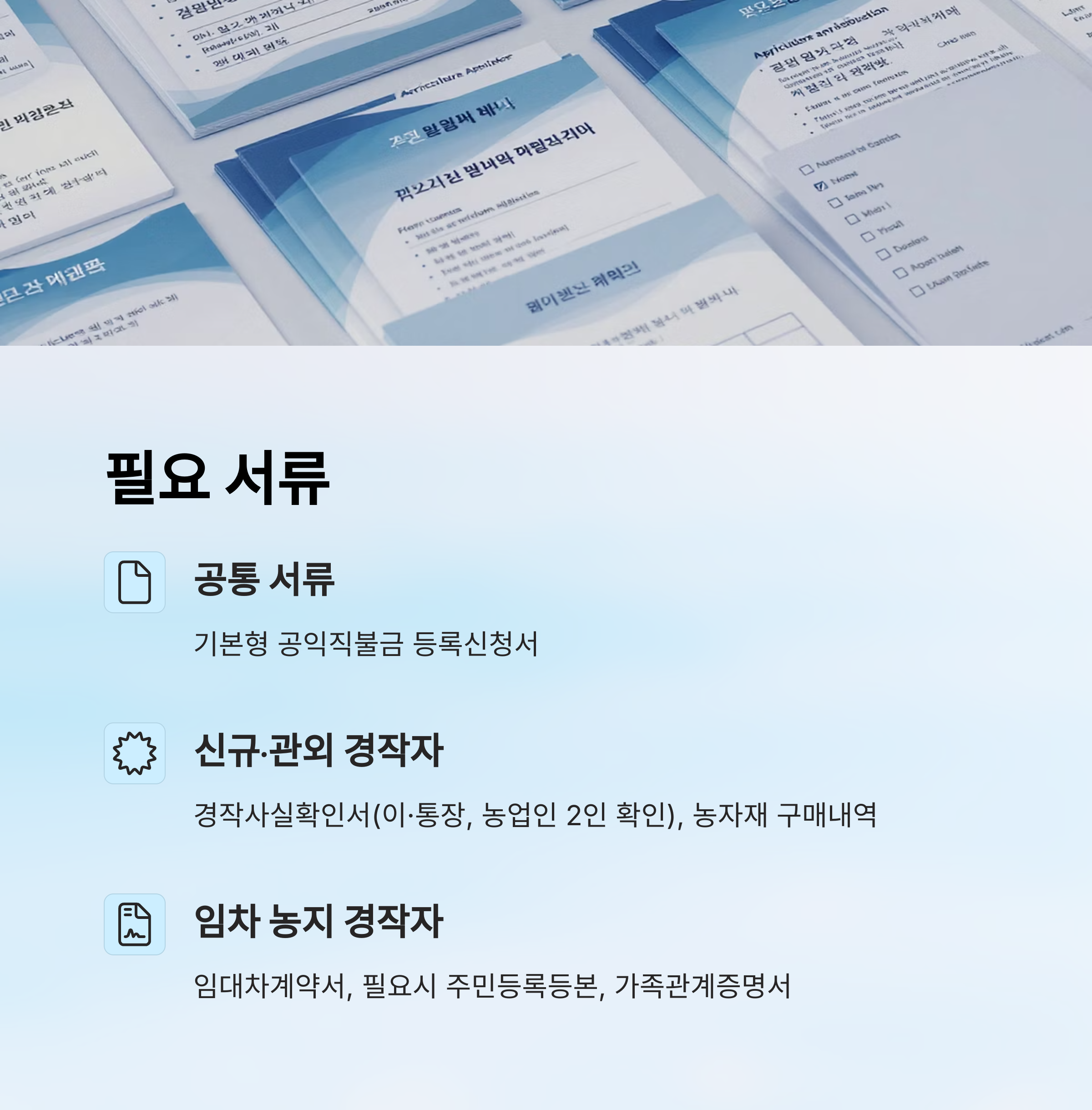 | 신규·관외 경작자 | 경작사실확인서, 농자재 구매내역 |