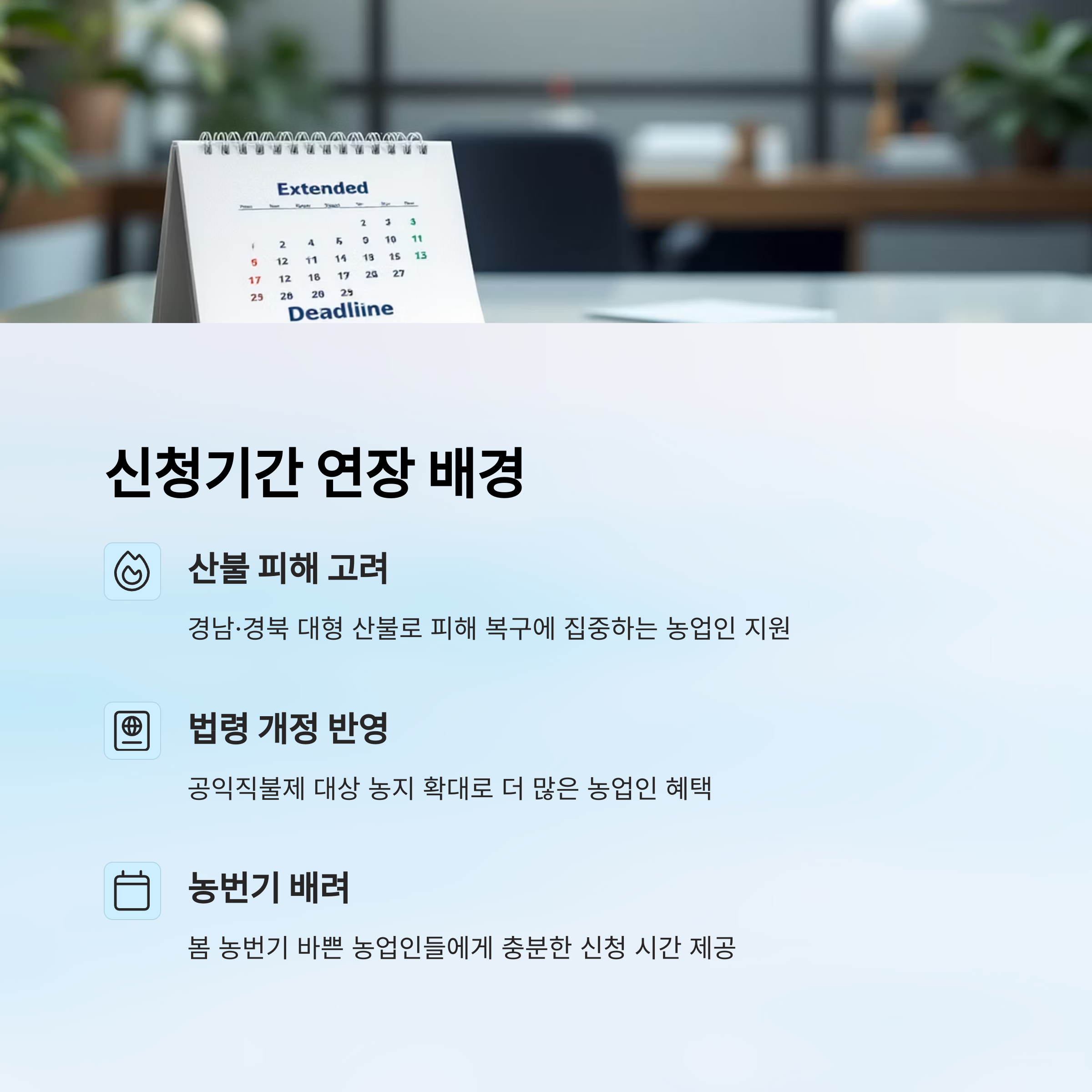 이번 연장 결정은 단순한 연기가 아니라, 농업인의 실제 상황을 고려한 현실적인 조치라는 점에서 매우 긍정적인 평가를 받고 있어요.👏