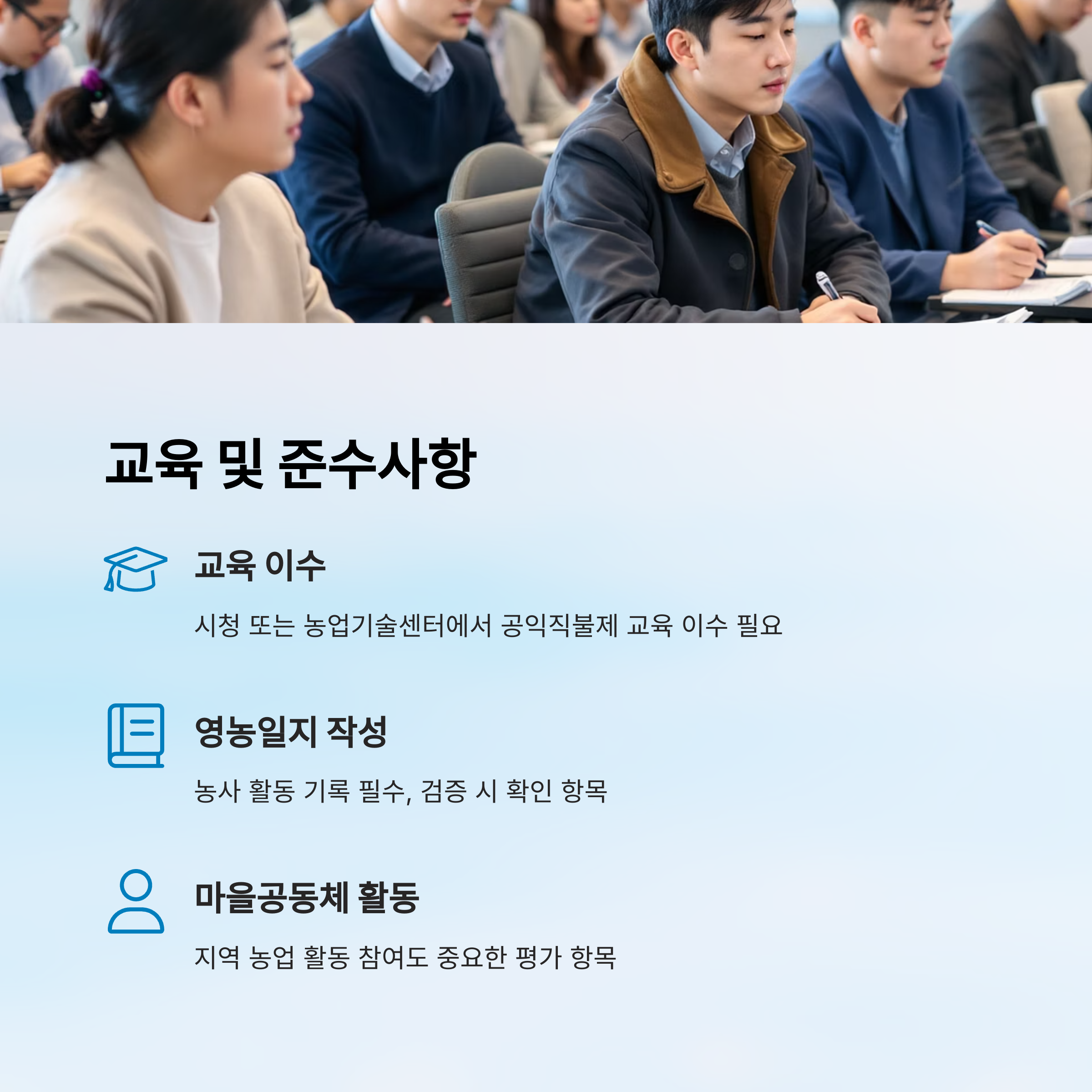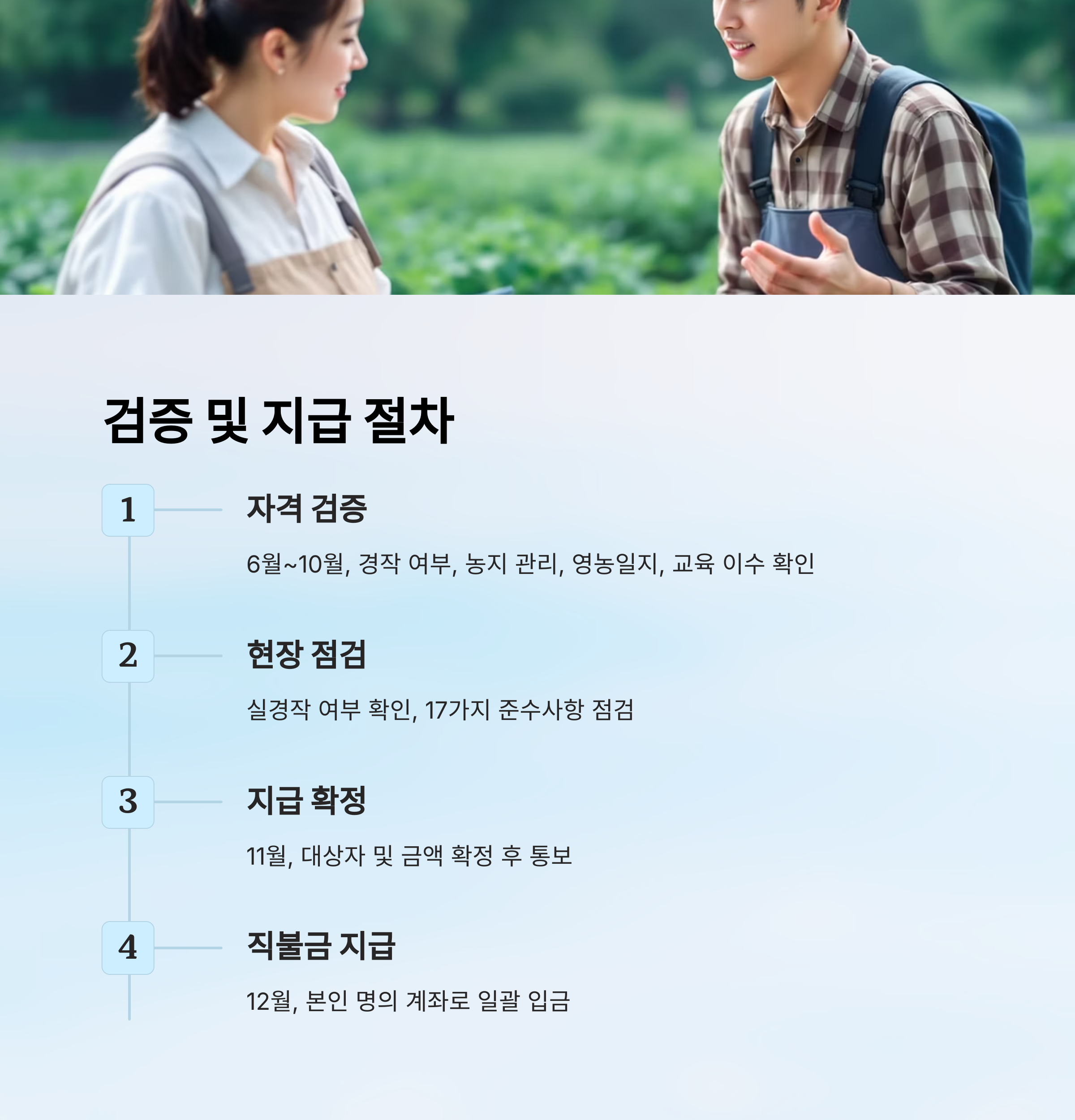 | 자격 검증 | 6월 ~ 10월 | 현장조사, 실경작 여부, 교육이수 확인 |