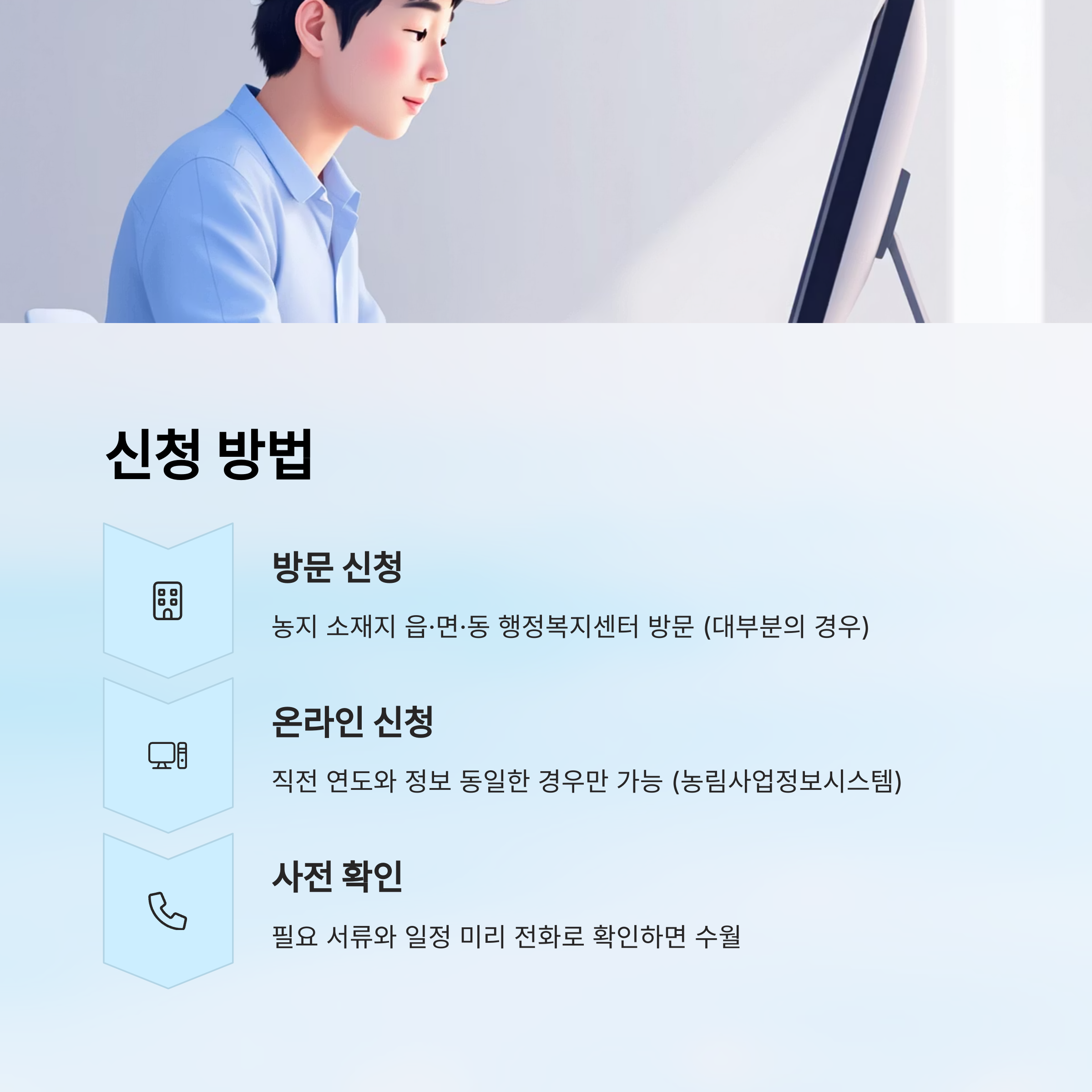 신청은 기본적으로 농지 소재지의 읍·면·동 행정복지센터에 방문해서 진행해야 해요. 오프라인 방문 신청이 원칙이지만, 일부 대상자라면 온라인 신청도 가능하답니다.