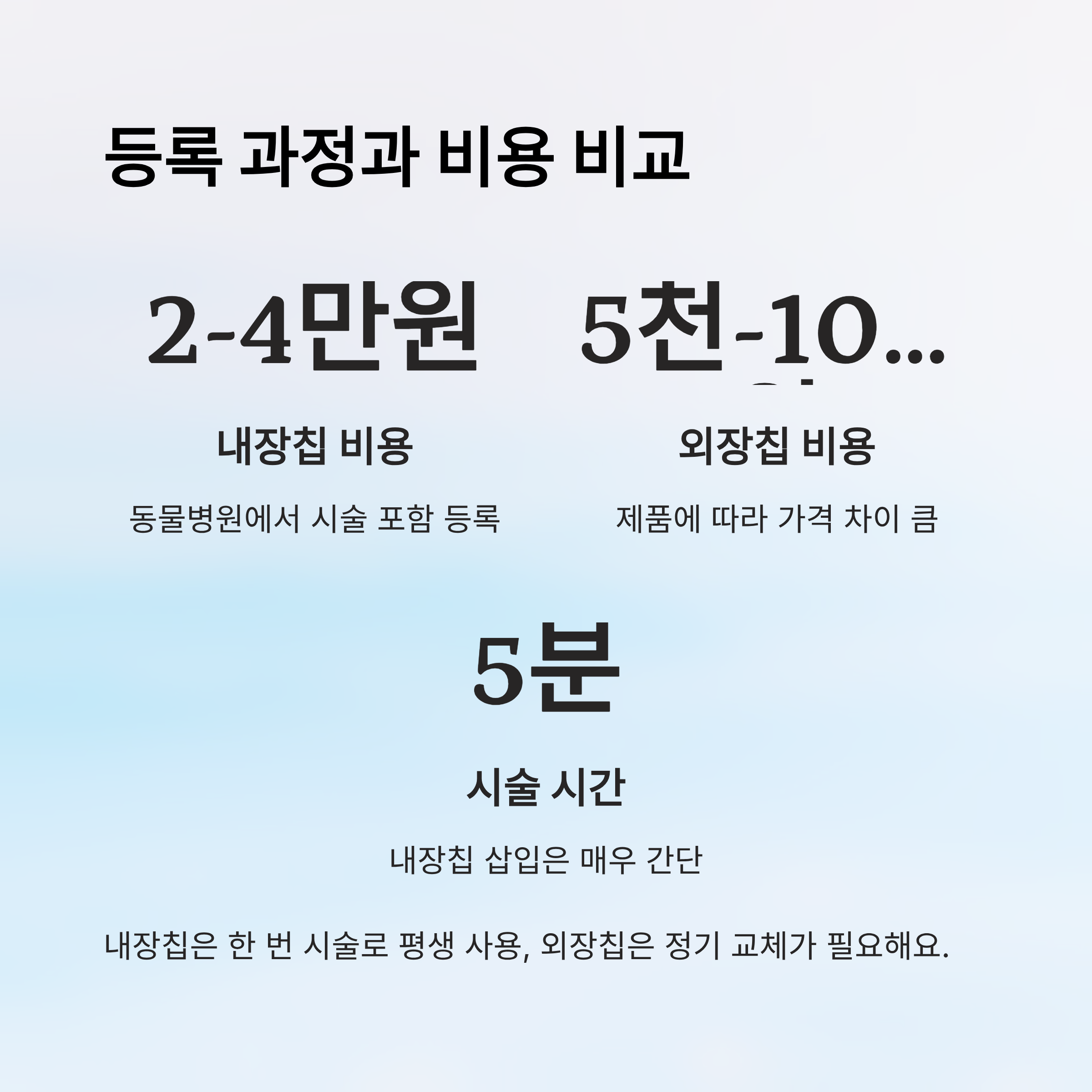 자, 이제 내장칩과 외장칩 각각의 장단점을 꼼꼼히 살펴봤어요. 다음 박스에서는 실제로 등록할 때 어떤 과정을 거치는지, 시술 방법과 비용을 비교해드릴게요! 💰