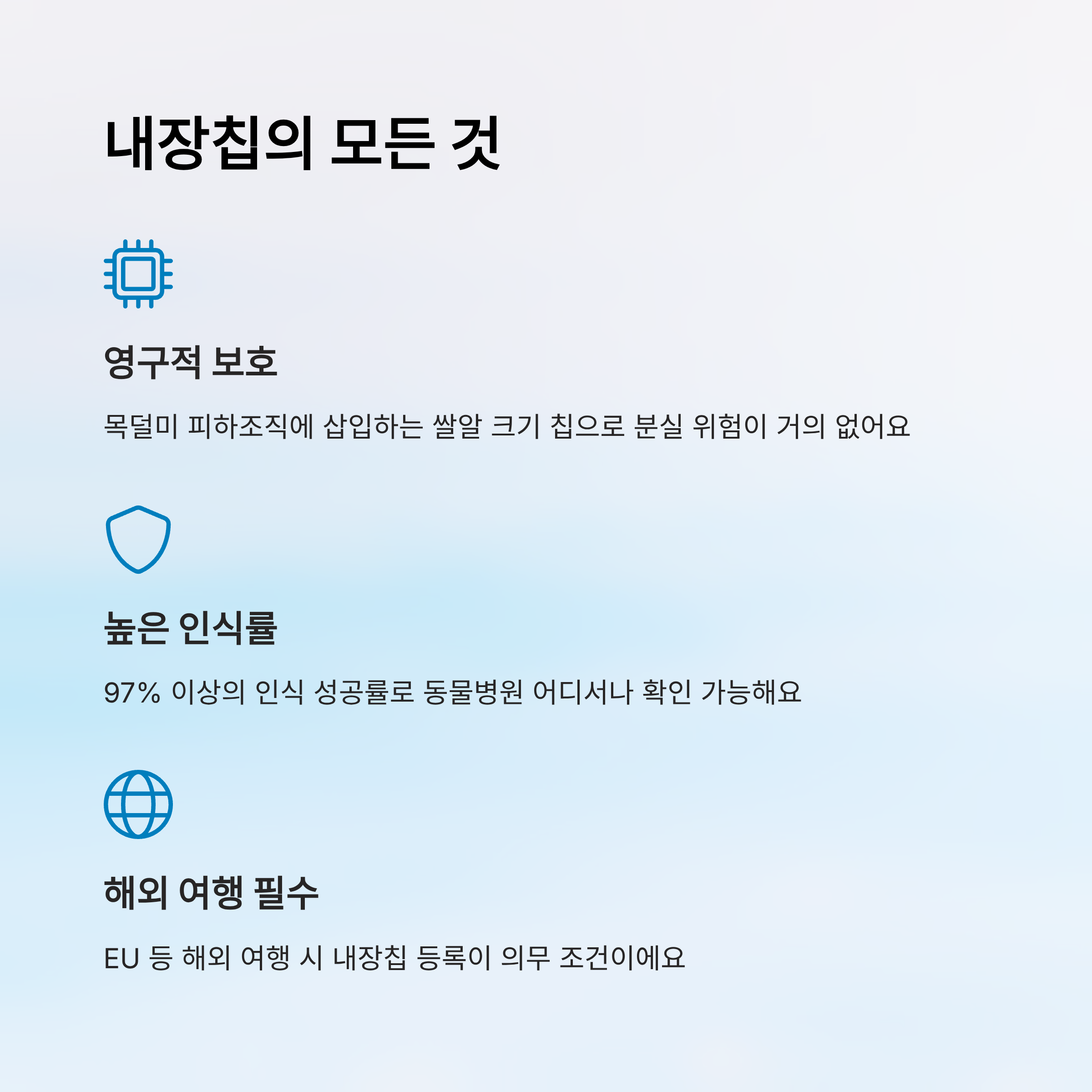 이번 포스팅에서는 내장형 칩과 외장형 칩의 모든 차이점과 실제 등록 과정, 비용, 인식률, 향후 제도 변화까지 완벽하게 비교해 드릴게요. 어떤 방식이 우리 아이에게 가장 적합한지 함께 고민해볼까요? 🐶🐱