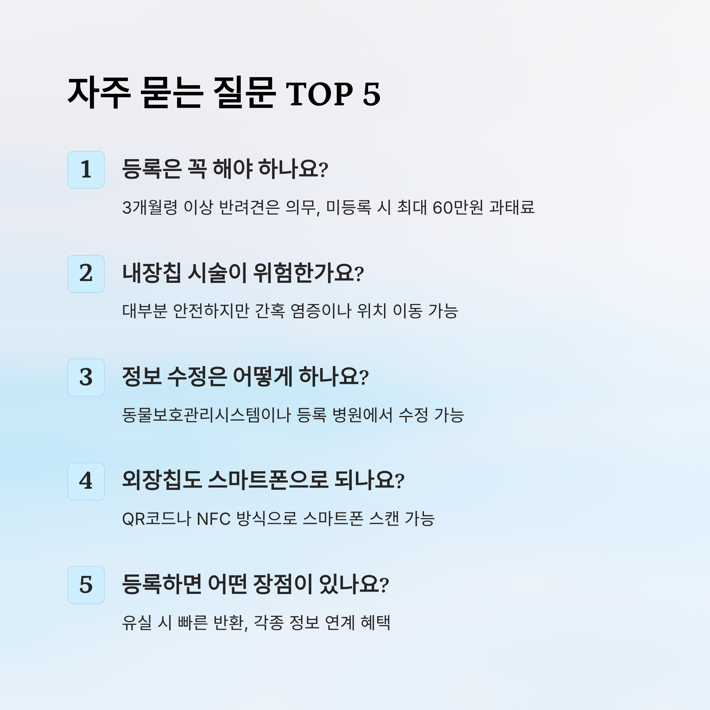 A6. 반려동물의 유실 시 빠른 반환이 가능하고, 예방접종·보험 등 다양한 정보와 연계될 수 있어요. 등록은 단순한 절차가 아니라 동물의 생명을 지키는 중요한 수단이에요.