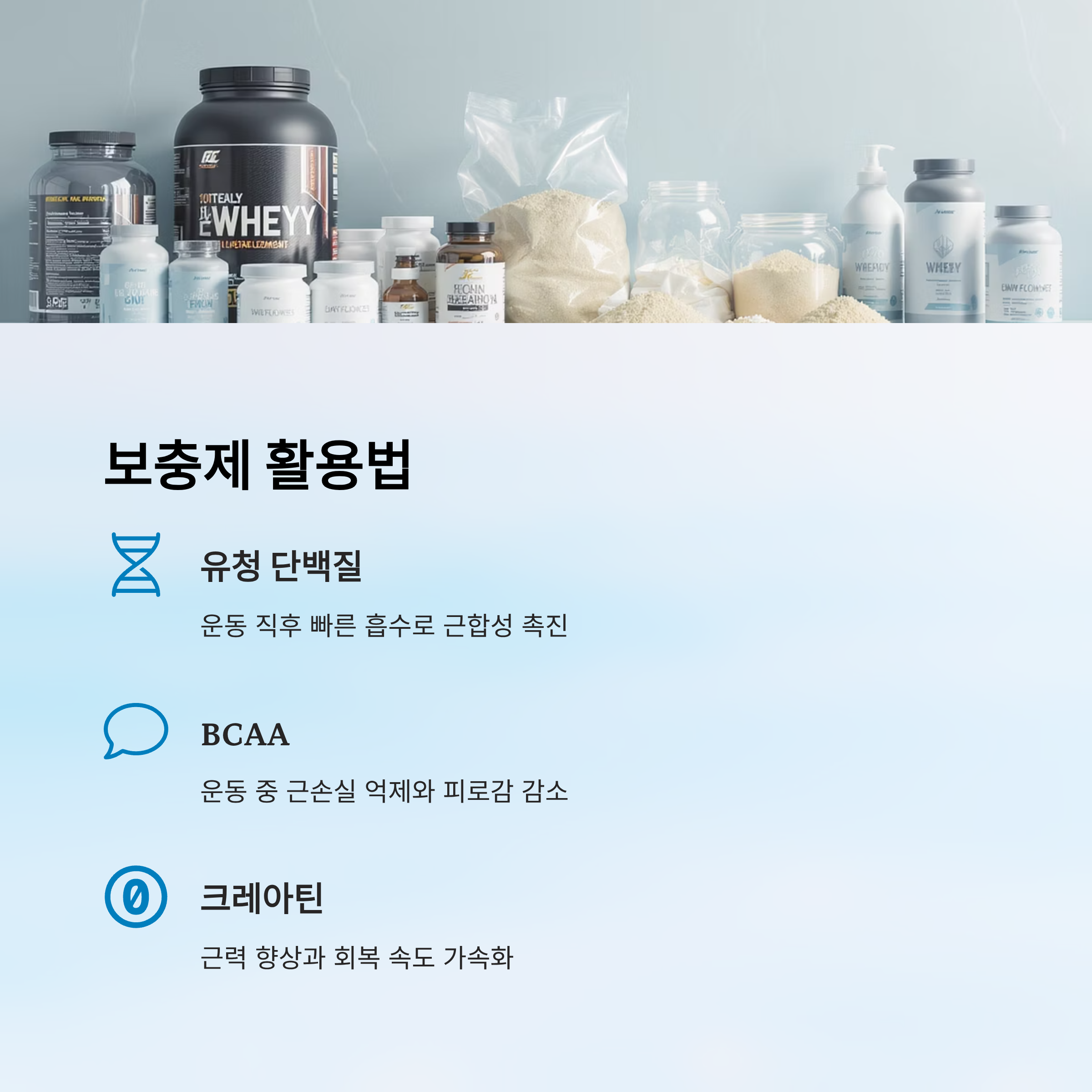 | 유청 단백질 | 운동 직후 | 빠른 흡수, 근합성 촉진 | 유당 민감 시 주의 |