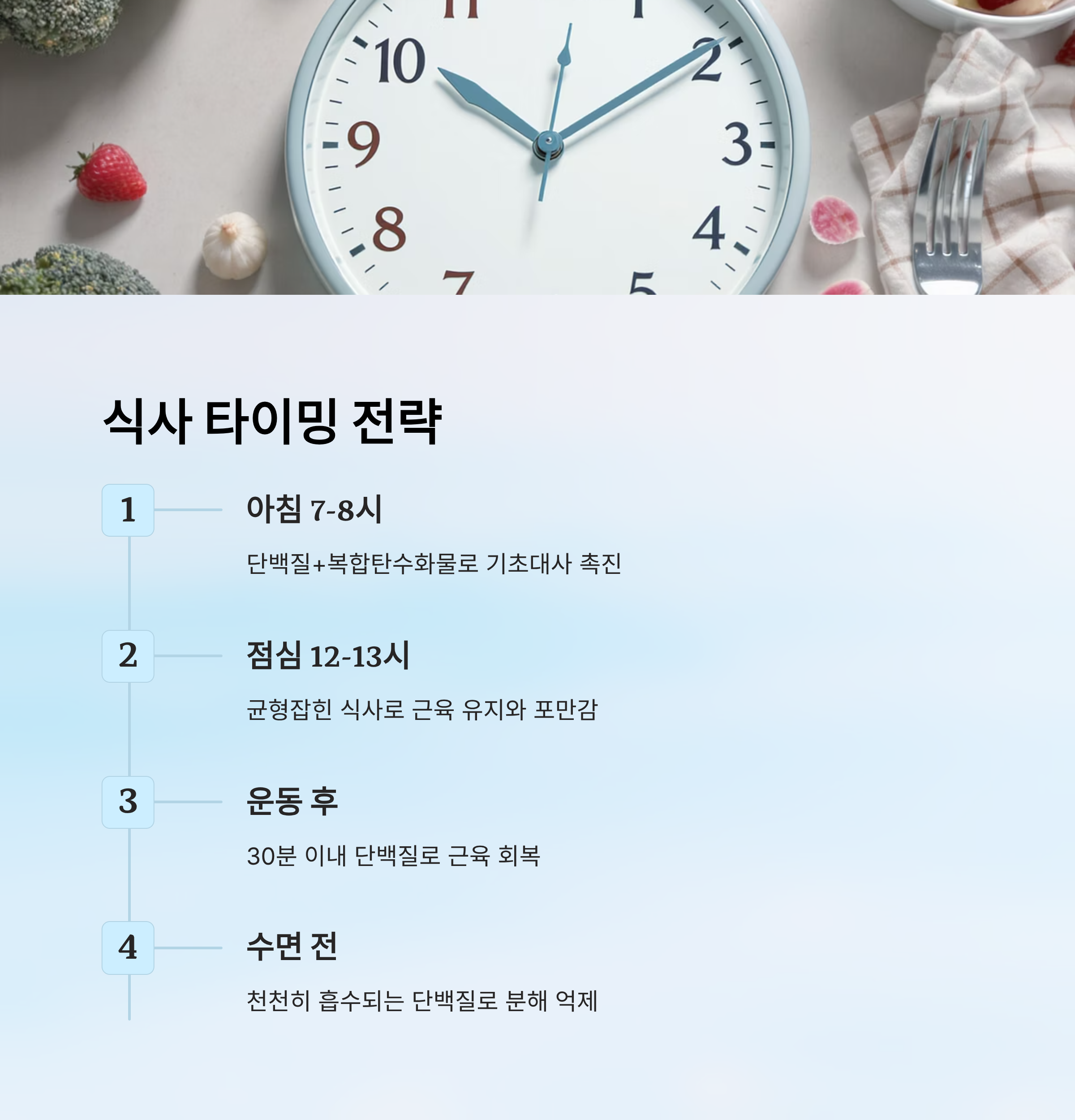 식단을 짤 때 '무엇을 먹느냐'만큼 중요한 게 '언제 먹느냐'예요. 대사율은 시간대에 따라 변하고, 이 리듬에 맞춰 음식을 섭취하면 근육 유지와 체지방 감량에 훨씬 유리해져요. 특히 아침 식사와 운동 전후 식사는 근손실 방지에 핵심이에요.