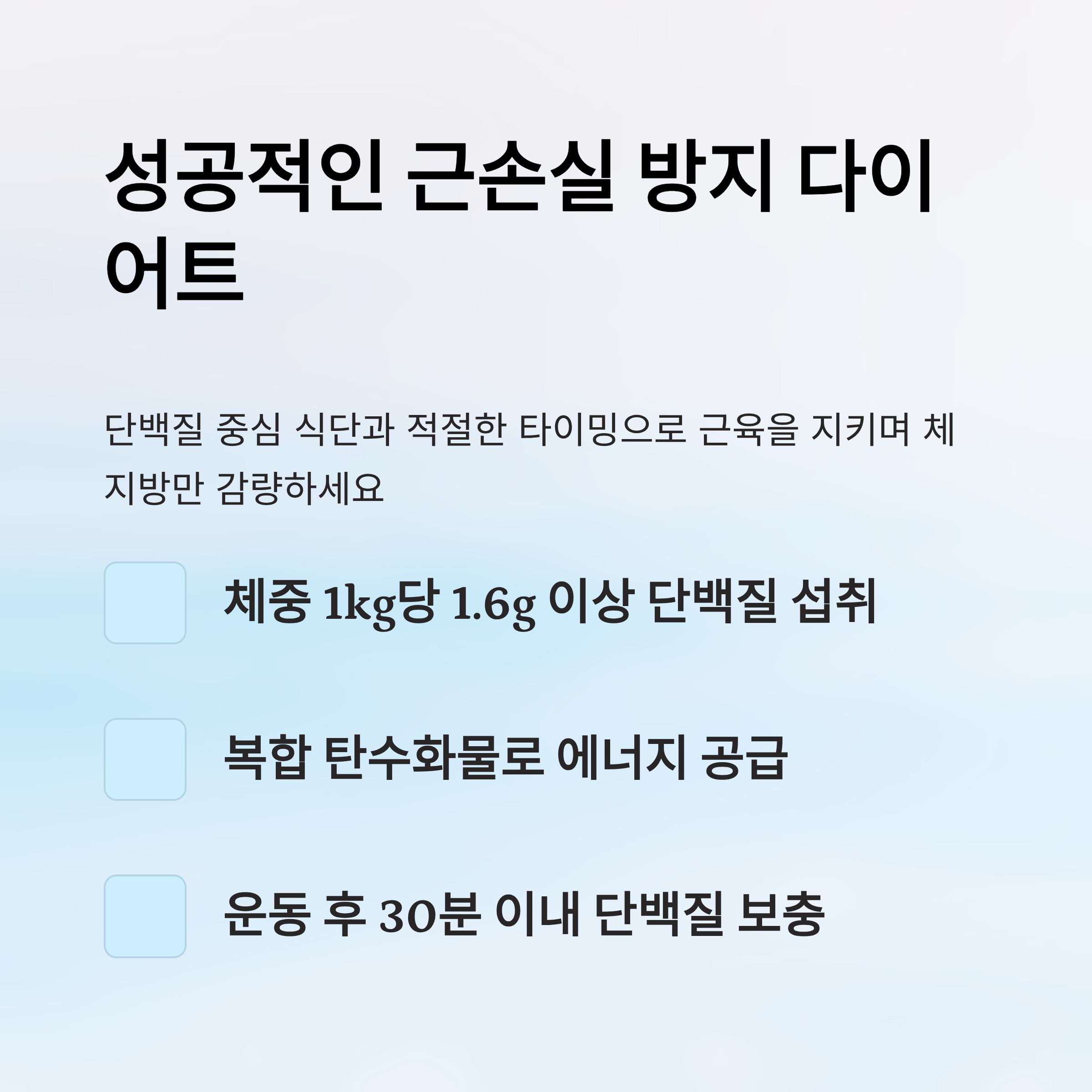 보충제는 어디까지나 ‘보조 수단’이에요. 제대로 된 식단 없이 보충제만으로는 근육을 지킬 수 없어요. 식사를 기반으로 하되, 부족한 부분만 스마트하게 채우는 전략이 필요해요! 💡