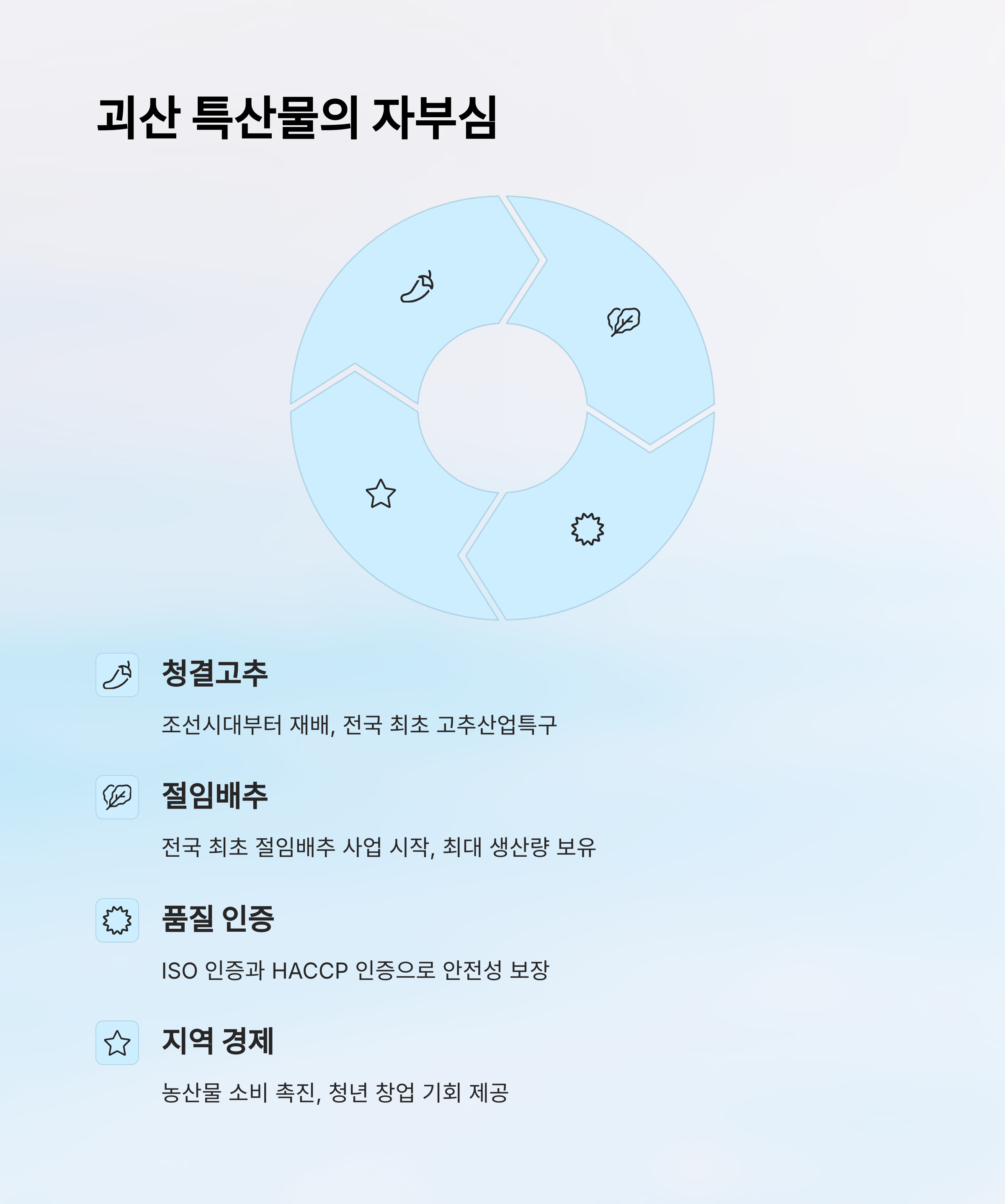 우선 괴산 청결고추는 조선시대부터 재배가 시작된 전통 깊은 작물이에요. 전국 최초로 고추산업특구로 지정된 곳도 바로 괴산! 그만큼 체계적인 품질관리와 기술지원이 이뤄지고 있죠. ISO 인증과 HACCP 인증까지 보유해 안전성과 위생도 철저하답니다.