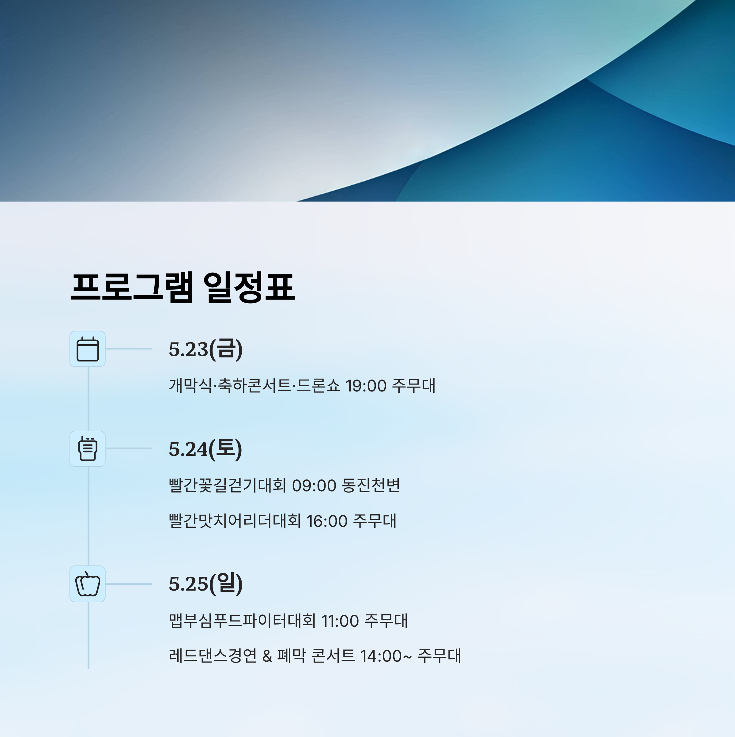 내가 생각했을 때 이 축제의 가장 특별한 점은 ‘빨간맛’이라는 콘셉트 하나로 먹거리, 볼거리, 놀거리, 찍을 거리까지 모두 아우른다는 거예요. 감각적인 테마에 감성적인 꽃길, 그리고 열정적인 경연이 더해져 그야말로 SNS에서 불붙을 수밖에 없는 축제죠! 🔥