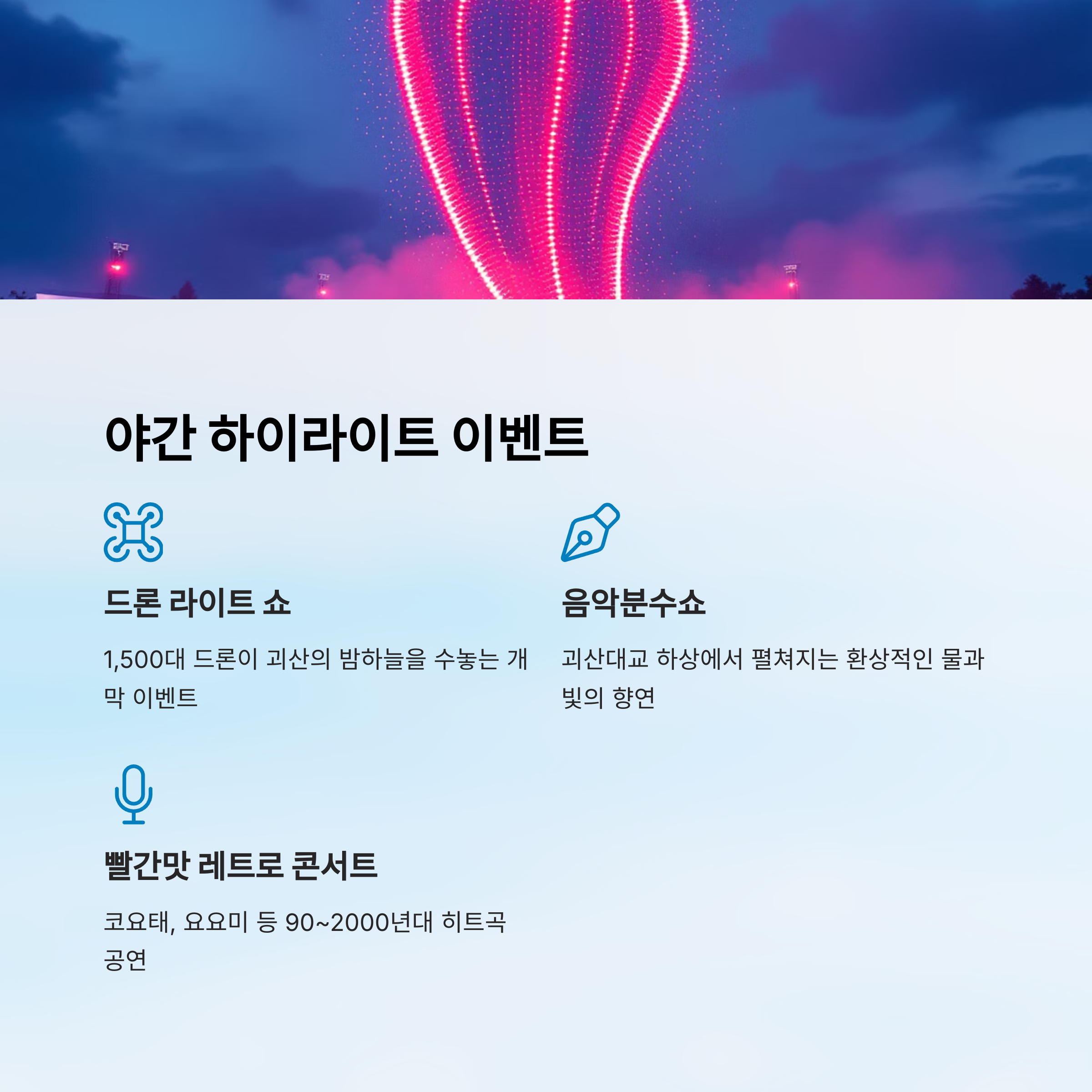 2025 괴산빨간맛페스티벌은 낮에도 화려하지만, 밤이 되면 완전히 다른 세상으로 변해요. 별이 쏟아질 듯한 하늘 아래 펼쳐지는 드론 라이트 쇼와 음악분수쇼는 이 축제의 백미라고 할 수 있어요. 대형 스케일에 현장감까지 더해져, 보는 순간 감탄이 절로 나와요 🌠
