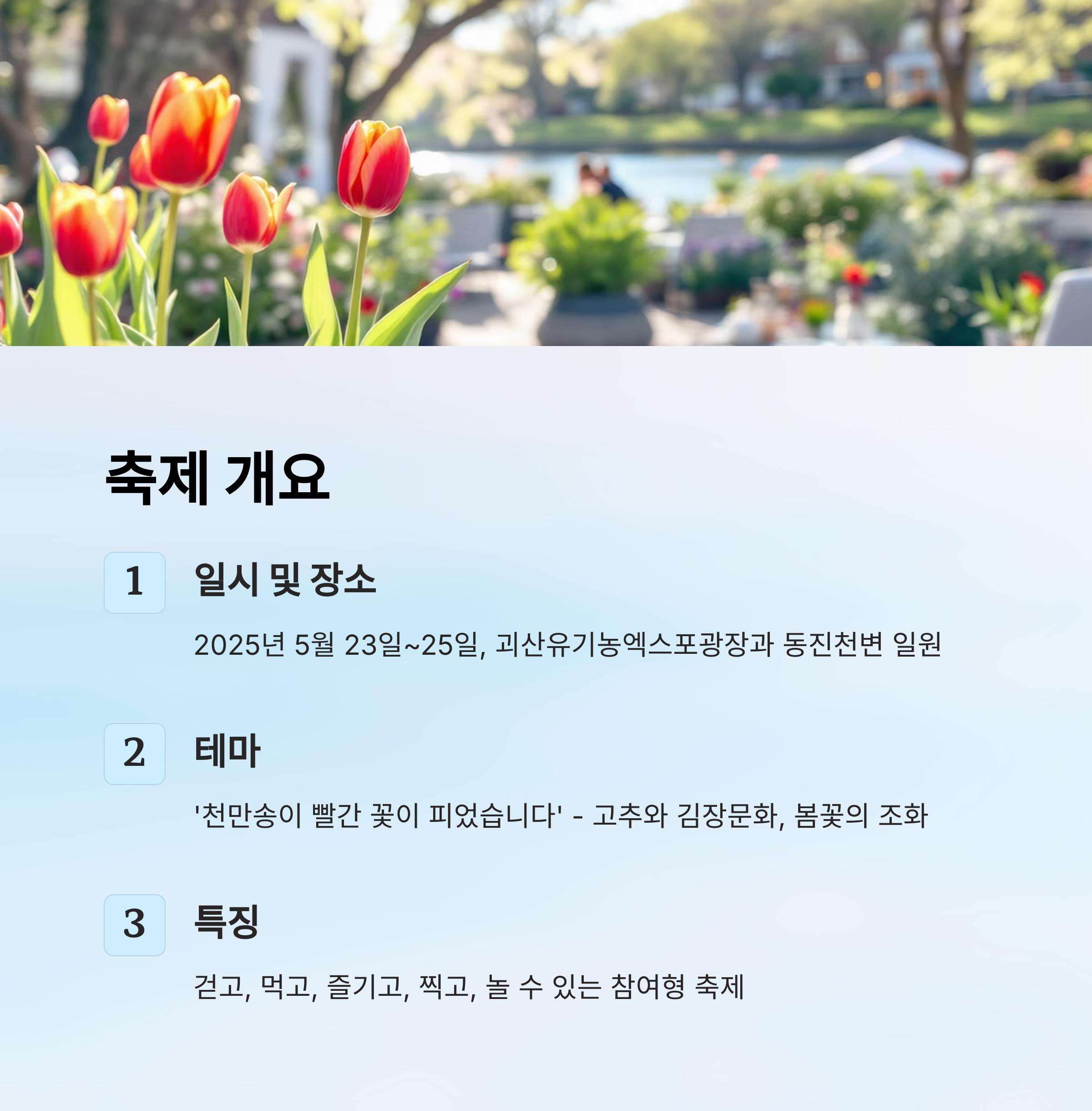 5월 23일 금요일부터 25일 일요일까지 괴산유기농엑스포광장과 동진천변 일원에서 열리는 이 페스티벌은 단순한 지역 행사 그 이상이에요. 전국 단위의 경연 대회부터 야경을 물들이는 대형 드론쇼까지, 다채로운 프로그램들이 기다리고 있어요. 자, 지금부터 이 축제를 100% 즐기는 법을 알려줄게요! 🌶️🌷