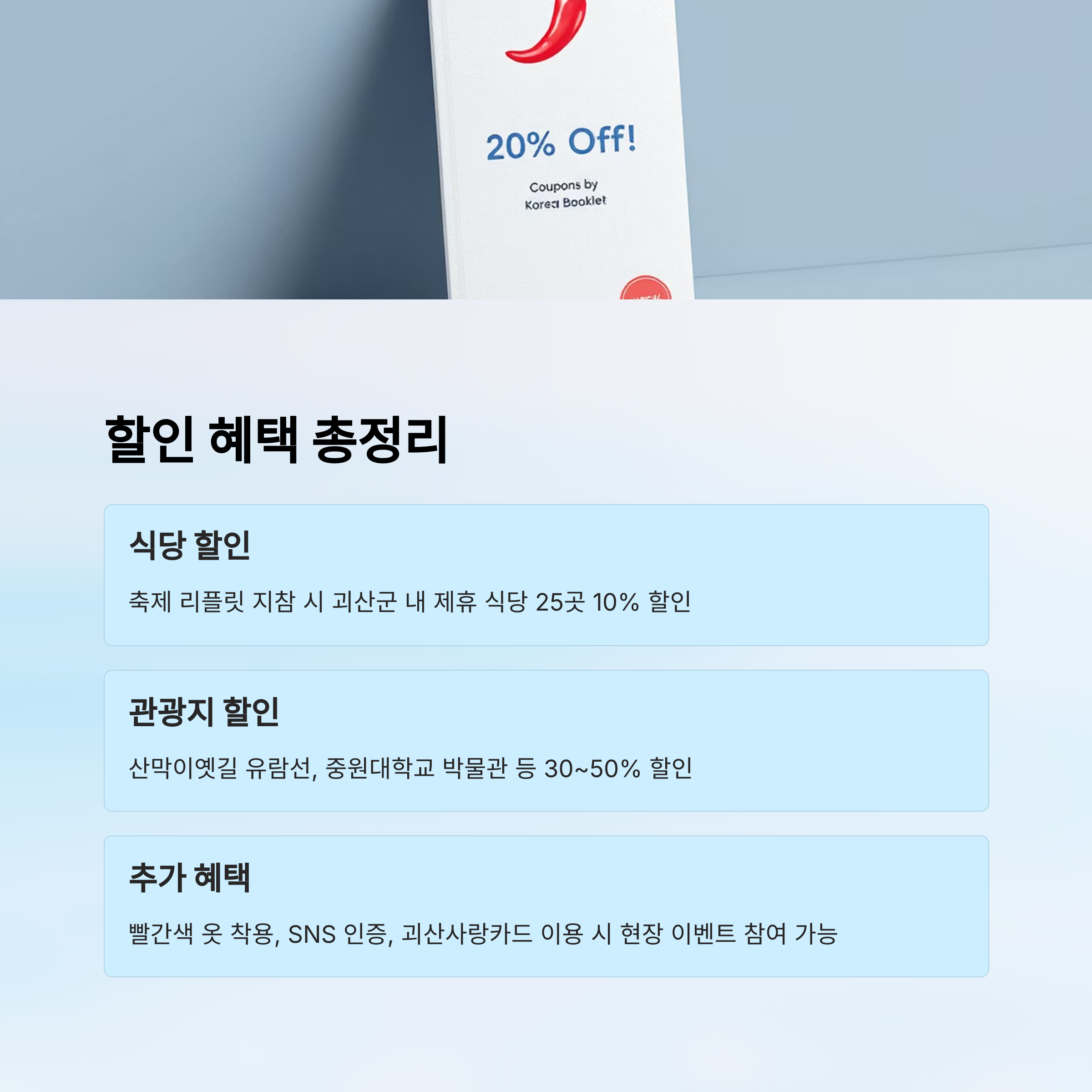 2025 괴산빨간맛페스티벌은 즐기는 재미뿐만 아니라, 실속 있는 혜택까지 챙길 수 있는 똑똑한 축제예요! 축제에 오기만 해도 다양한 할인과 이벤트가 준비되어 있어서, 알뜰하게 즐기고 싶은 분들에게 딱이에요 🎟️
