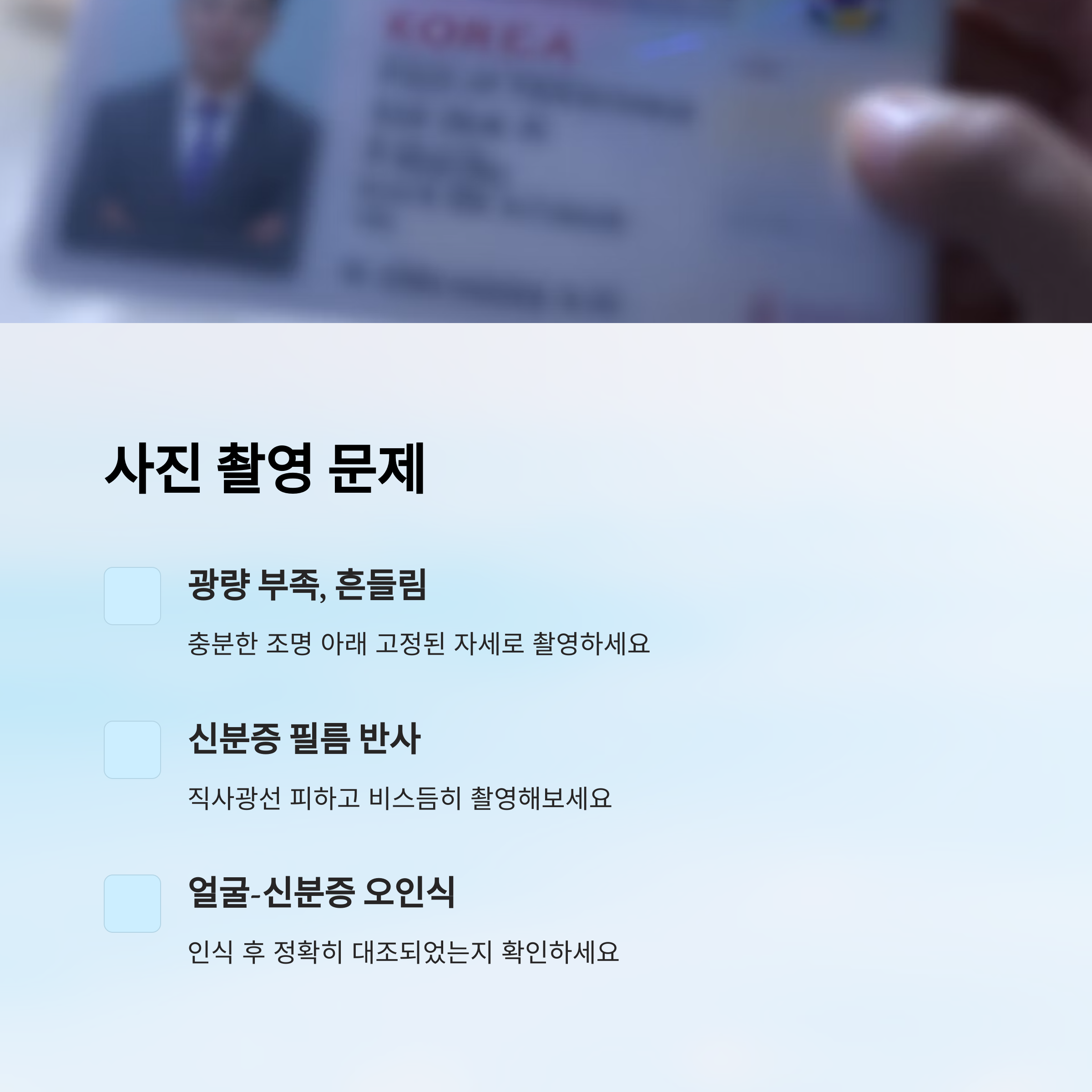 📸 1. 사진 촬영 오류 흐릿한 사진, 반사, 잘린 면허증/신분증 사진은 자동 인식 시스템이 거절해요.