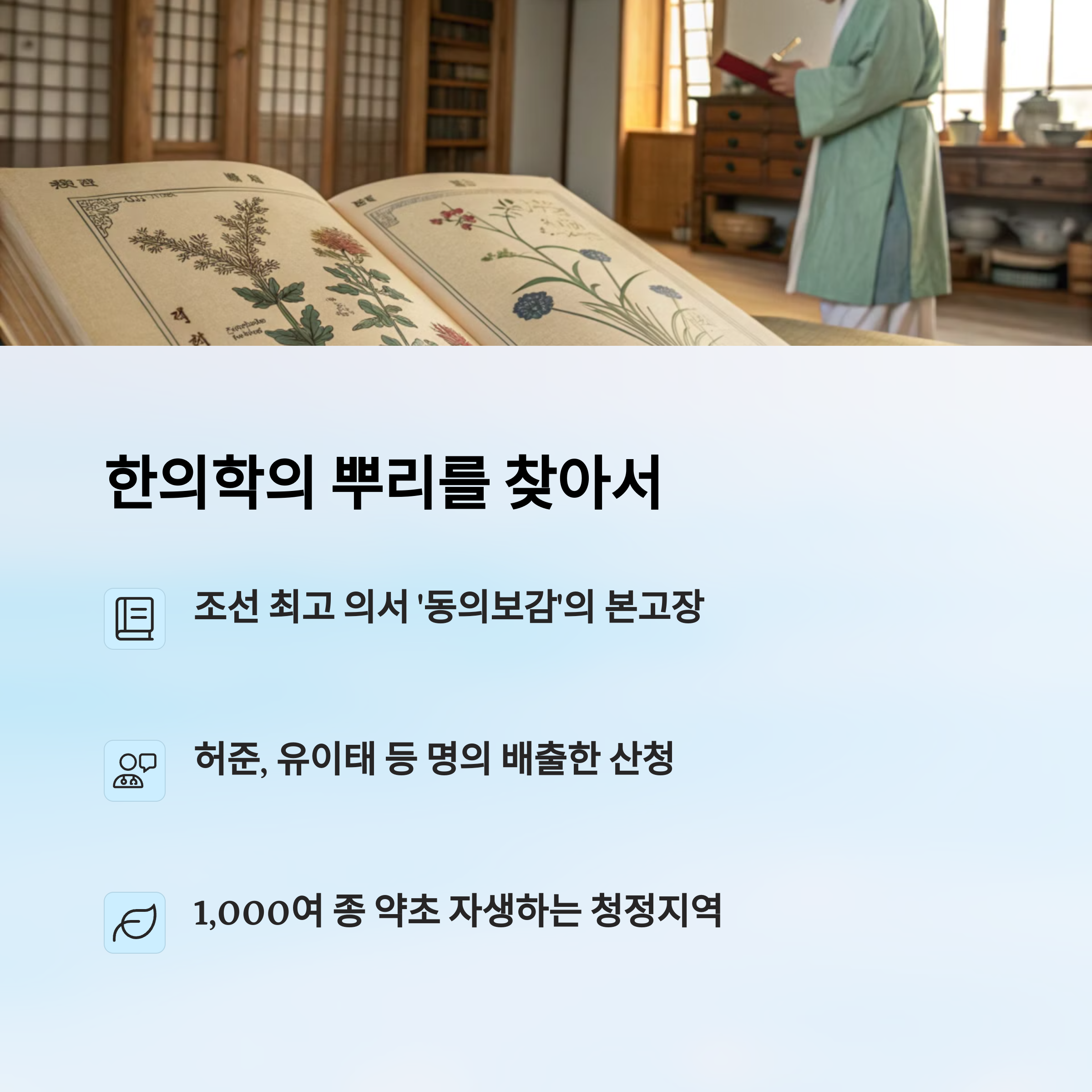 '동의보감'은 1613년에 완성된 의학 백과사전으로, 유네스코 세계기록유산에도 등재된 세계적 가치의 의서예요. 우리 몸의 균형과 자연과의 조화를 강조하는 이 철학이 고스란히 동의보감촌에 녹아들어 있어요.