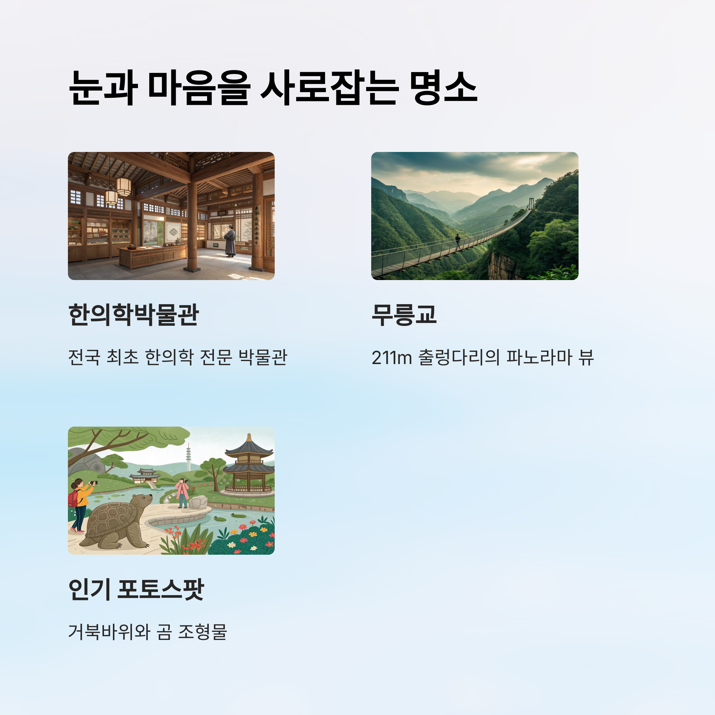 이처럼 동의보감촌은 전통 의학의 철학을 현대에 잘 녹여낸 건강 마을이에요. 한방의 지혜와 자연의 힐링이 조화를 이루는 이곳은 누구나 편안함을 느낄 수 있는 특별한 공간이에요.🍀