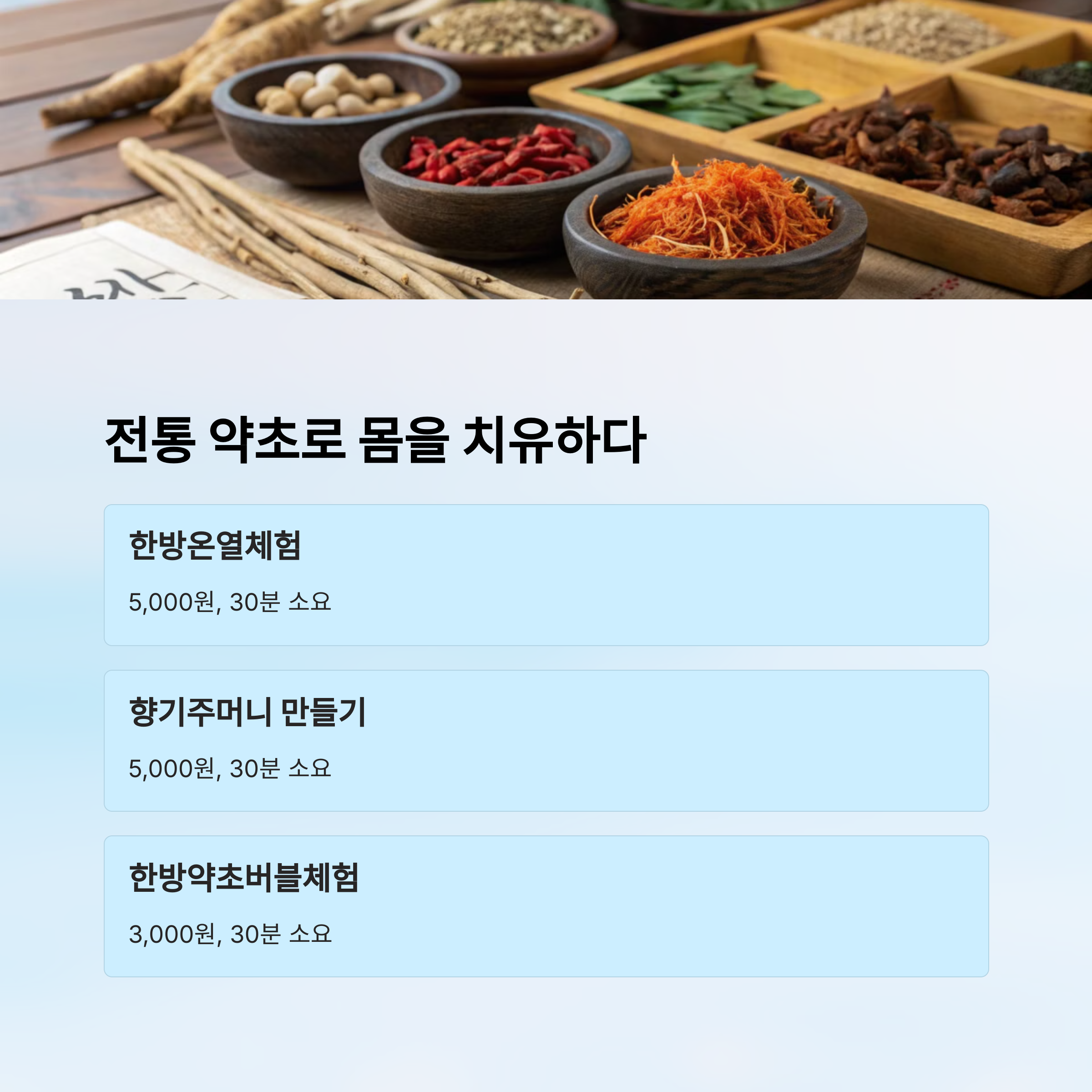 이 약초들을 활용한 다양한 체험 프로그램이 운영되는데, 대표적으로는 약초 족욕, 한방 찜질, 한방 비누 만들기, 허브차 시음 등이 있어요. 직접 만지고, 느끼고, 마시며 한방을 오감으로 체험할 수 있어요!