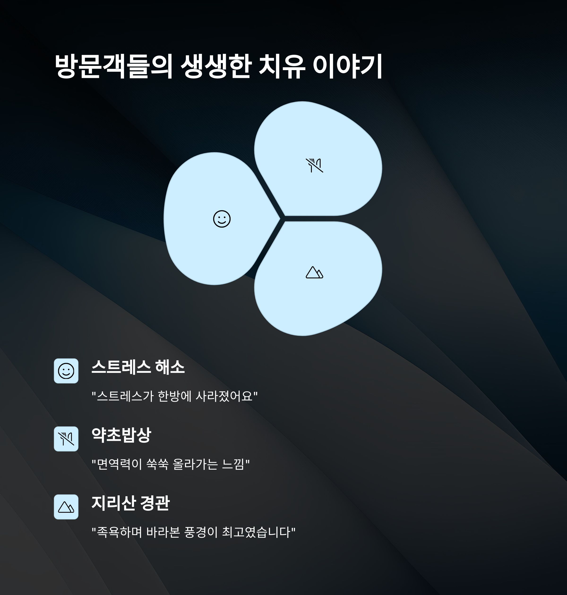 "진짜 산 속에서 힐링하고 나온 기분이에요!"라는 후기가 많아요. 지리산의 자연과 한방의 조화가 만든 조용하고 편안한 공간은 도심의 피로를 확실히 풀어주는 느낌이에요.