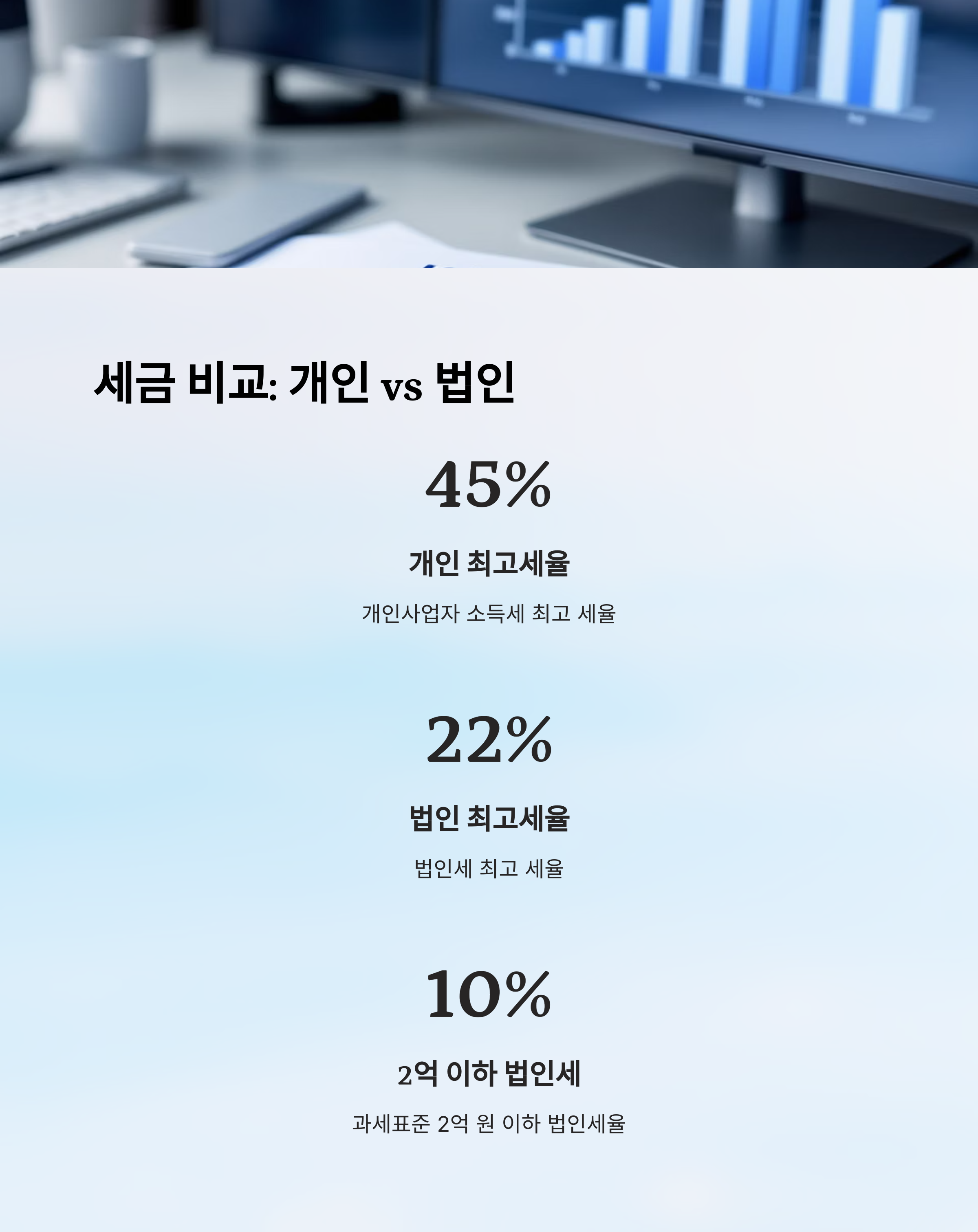 2025년 기준으로 개인사업자의 소득세율은 최고 45%까지 적용되지만, 법인은 과세표준 2억 원 이하일 때 10%, 2억 초과~300억 원은 20%, 그 이상은 22%예요. 이 차이는 누적될수록 굉장히 큰 세금 차이를 만들어요.