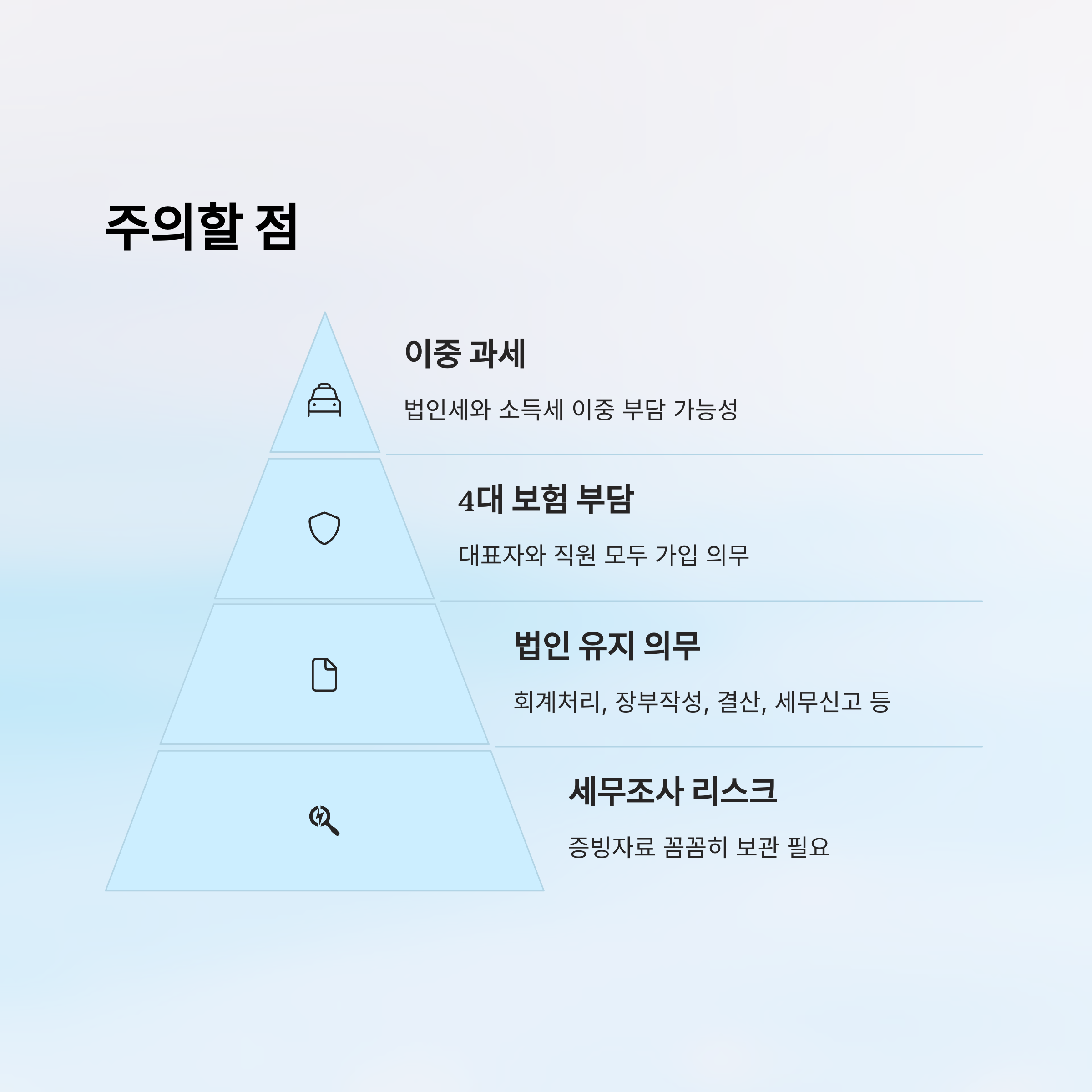 두 번째는 4대 보험 부담이에요. 법인이 되면 대표자와 직원 모두 국민연금, 건강보험, 고용보험, 산재보험을 가입해야 해요. 특히 인건비가 많아질수록 사업체 입장에서는 보험료 부담이 만만치 않을 수 있어요. 따라서 인건비와 복리후생비 계획도 꼭 세워야 해요.