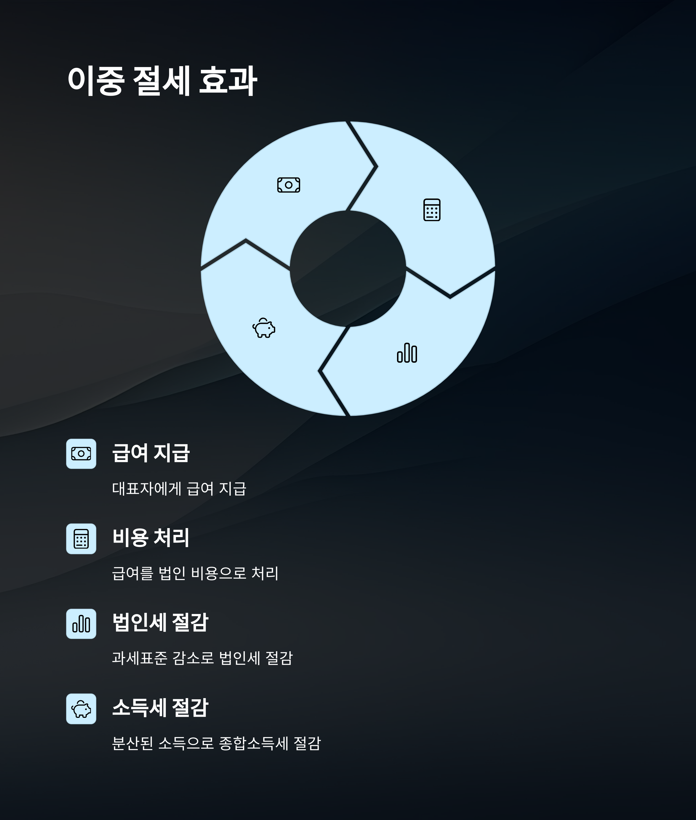 법인은 대표자에게 급여를 지급하고, 필요하면 상여금이나 배당으로 소득을 나눠 가져갈 수 있어요. 그 결과 종합소득세를 절감하면서도 회사는 급여를 비용 처리하여 법인세도 줄일 수 있어요. 이게 바로 '이중 절세 효과'예요. 🤩