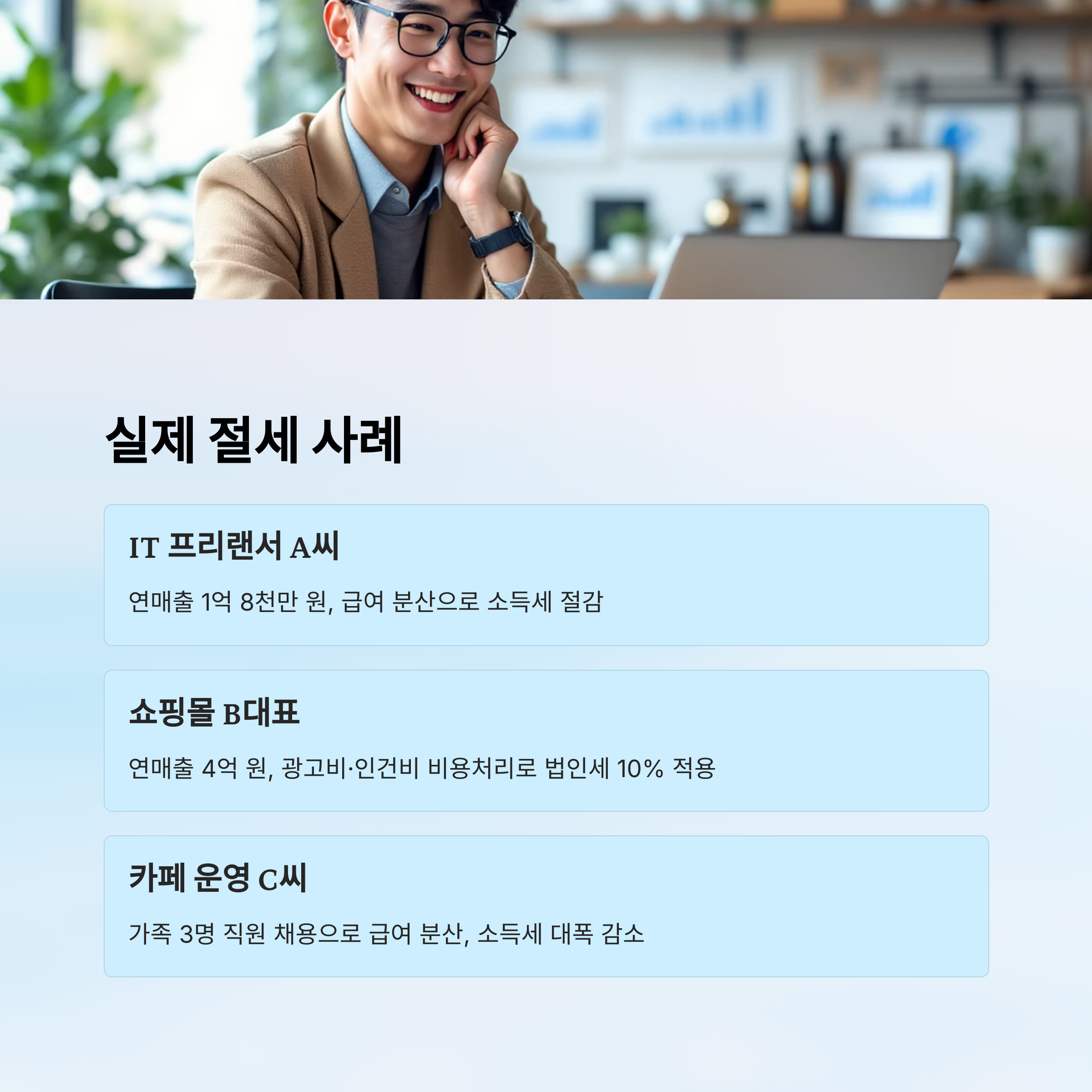 | A씨 | IT 프리랜서 | 급여 분산, 법인 설립 | 종합소득세 감소 |