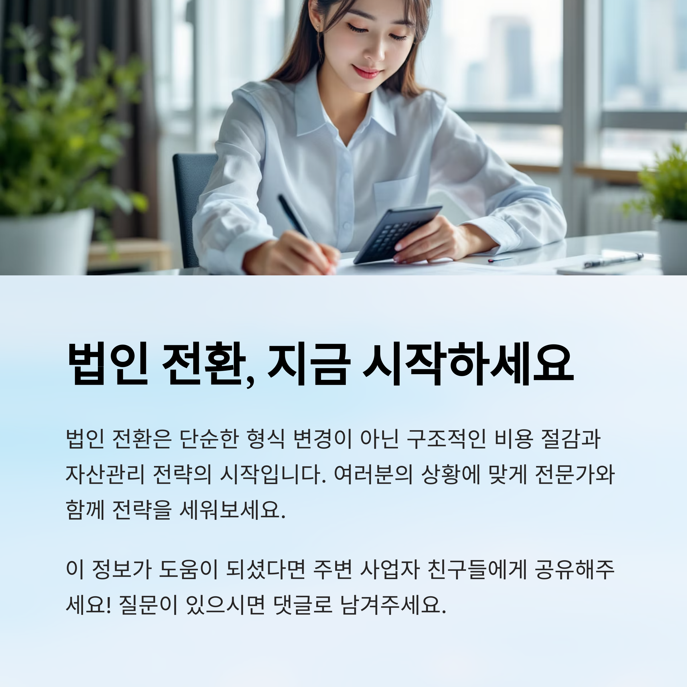 이처럼 다양한 업종과 상황에 맞게 절세 전략을 세울 수 있어요. 법인 전환은 단순한 '형식 변경'이 아니라, 구조적인 비용 절감과 자산관리 전략으로 이어지는 큰 그림의 시작이에요.