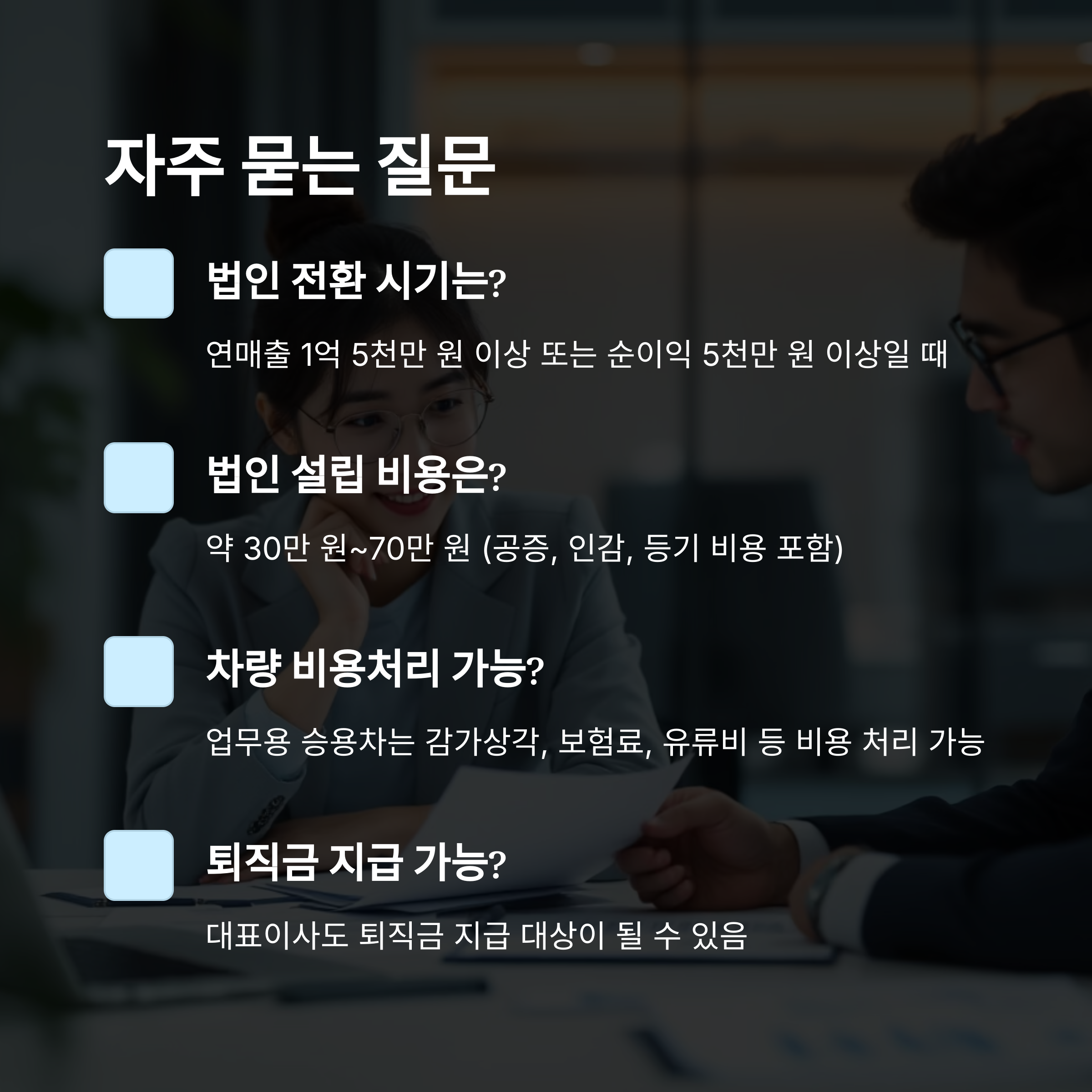 이처럼 단순히 '세금 아낀다'는 이유만으로 법인 전환을 하기보다는, 전환 이후 운영 방식과 책임 구조까지 충분히 고민해야 해요.