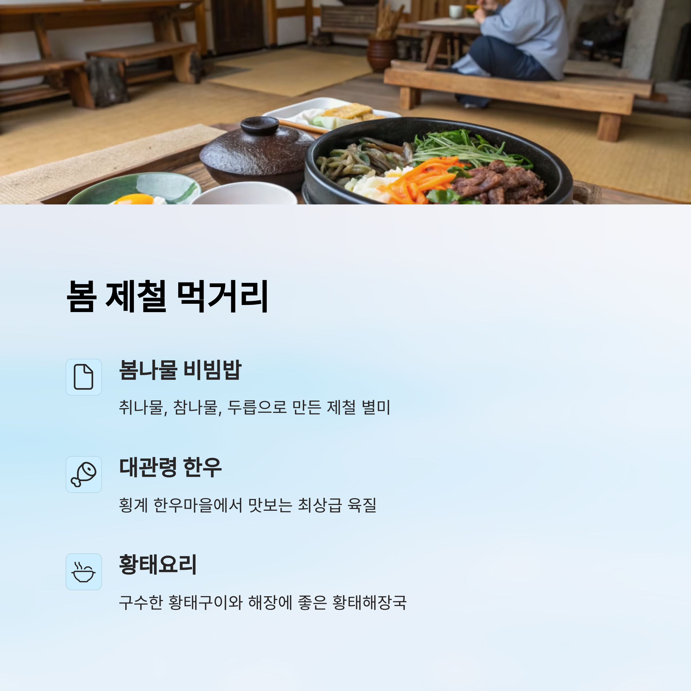 여행에서 빠질 수 없는 건 뭐니 뭐니 해도 ‘먹는 즐거움’이죠! 특히 대관령은 청정 자연 속에서 자란 재료들이 가득해서 봄철이면 그 맛이 배가 돼요. 봄나물 향긋한 비빔밥부터, 입에서 살살 녹는 한우, 신선한 유제품까지 지역 특산물이 정말 다양하답니다 🍚🥩