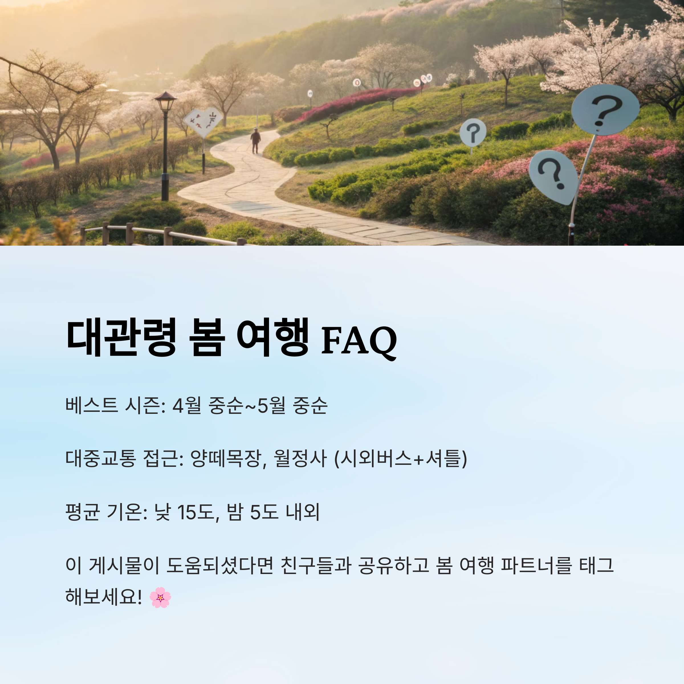 📌 이 글에서 소개한 대관령의 봄은 자연과 힐링, 체험과 미식이 모두 어우러진 정말 특별한 시간이었어요. 여유롭게 천천히, 봄바람 따라 대관령을 걸어보세요 🌸