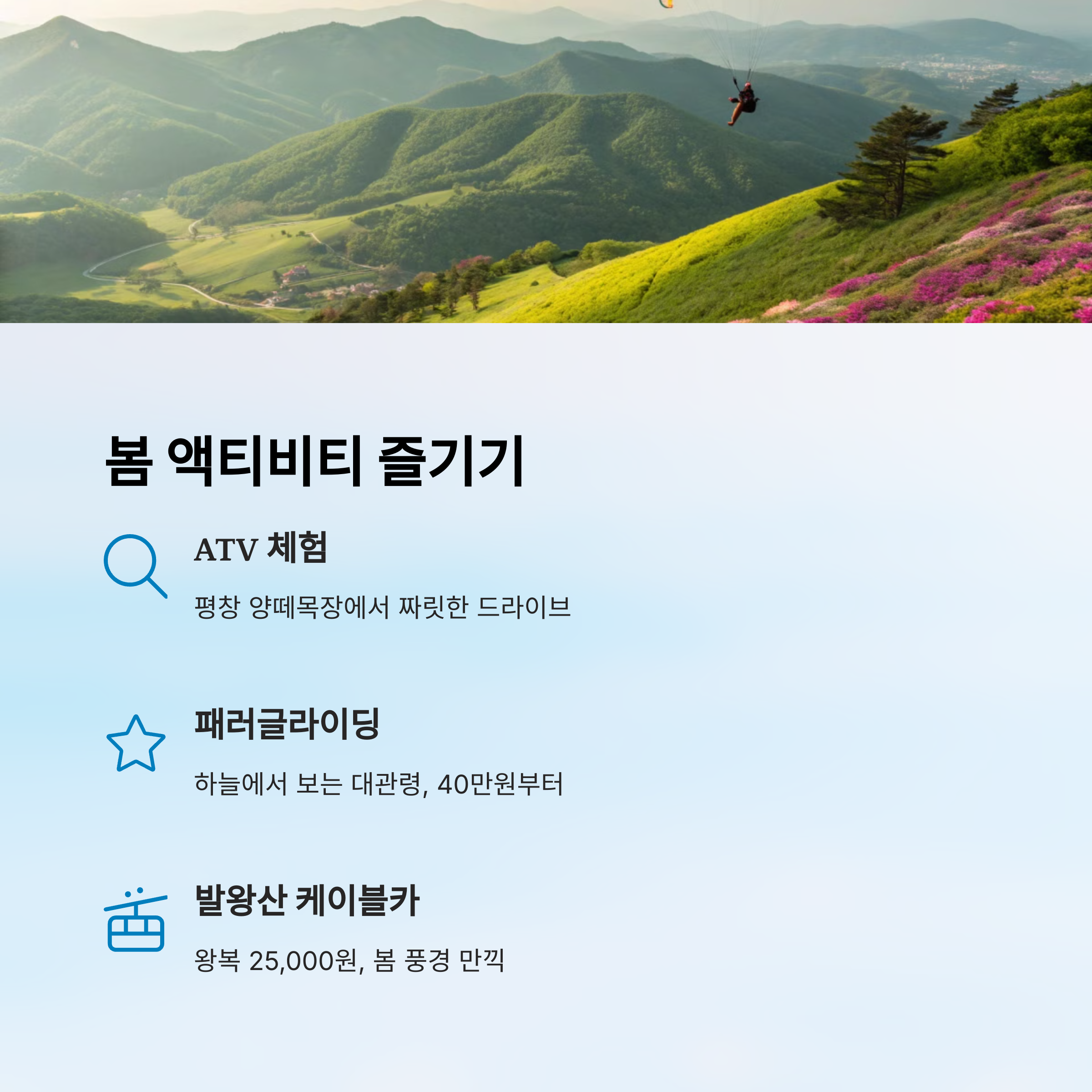| 패러글라이딩 | 횡계/용평 | 10:00~17:00 | 전문 강사 동반 비행 | 약 100,000원 |