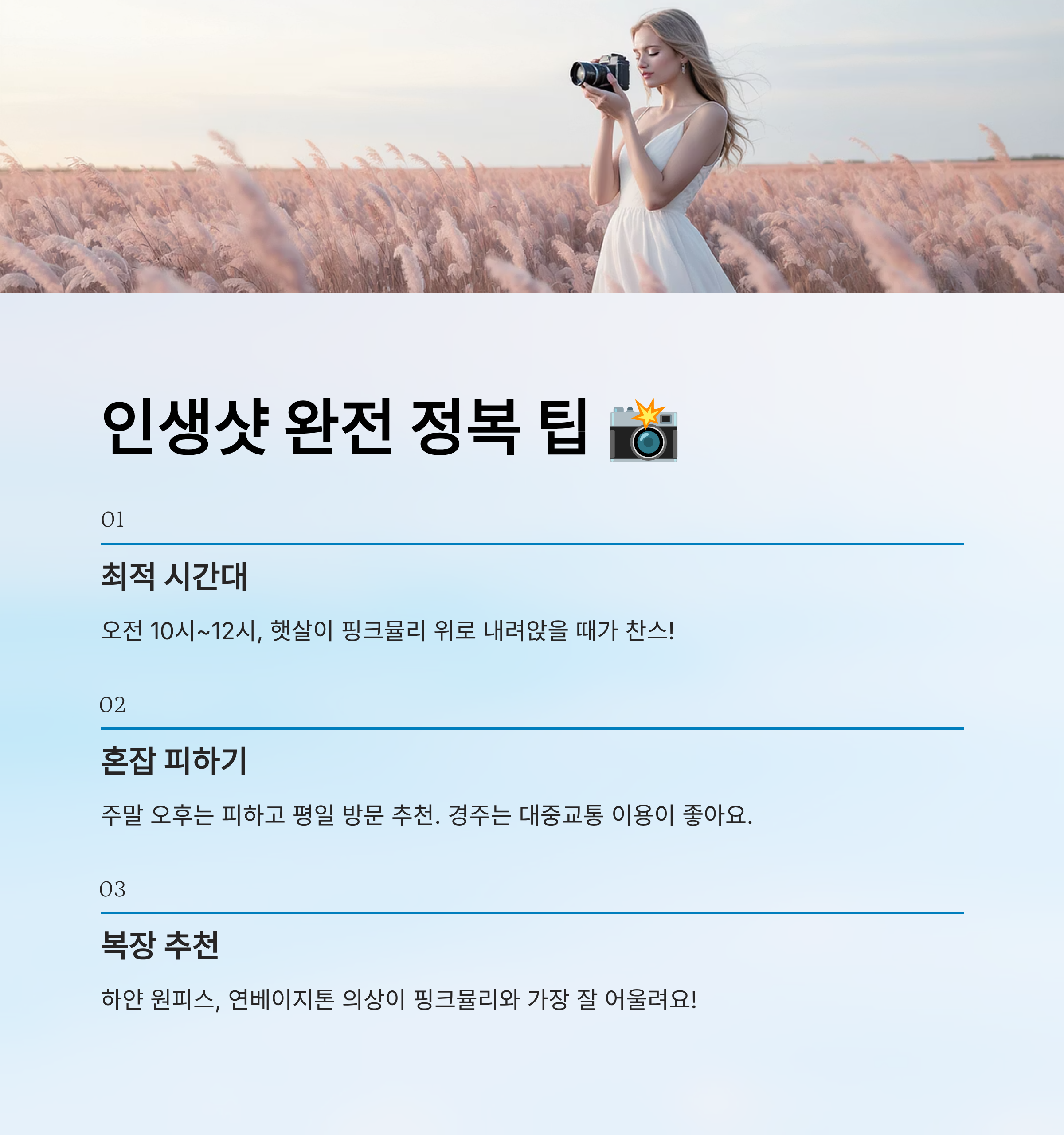 👒 복장 추천: 하얀 원피스, 연베이지톤 의상은 핑크뮬리 배경과 가장 잘 어울려요. 아이들과 함께 갈 땐 비눗방울 소품도 인생사진을 남기는 데 좋아요!