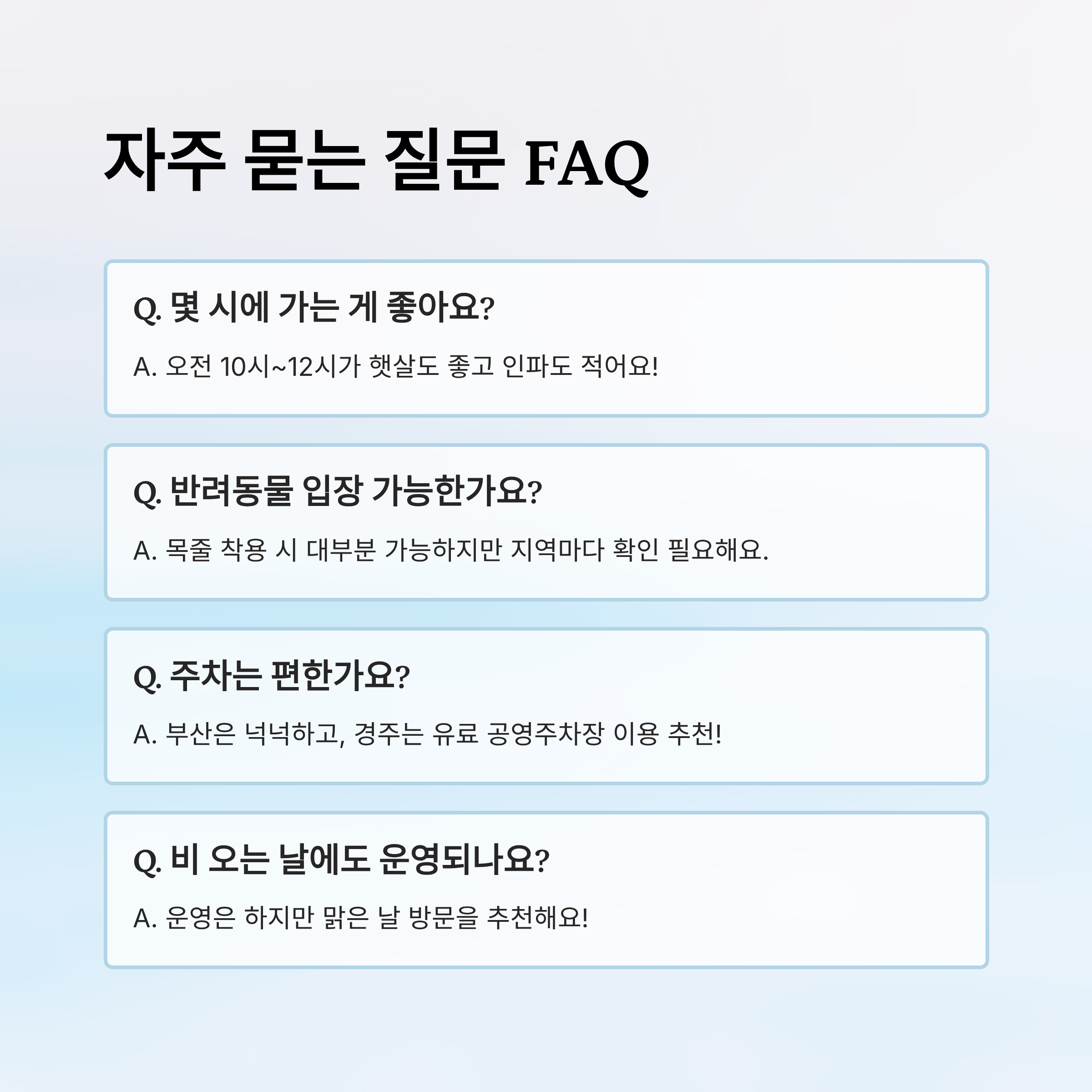 🚶♀️ 혼잡 피하는 방법: 주말 오후는 피하는 게 좋아요. 특히 경주는 주차도 혼잡하니 대중교통 이용이 좋아요. 창원이나 부산은 도심 속에 있어 접근이 편하니 평일 방문이 꿀팁이에요.