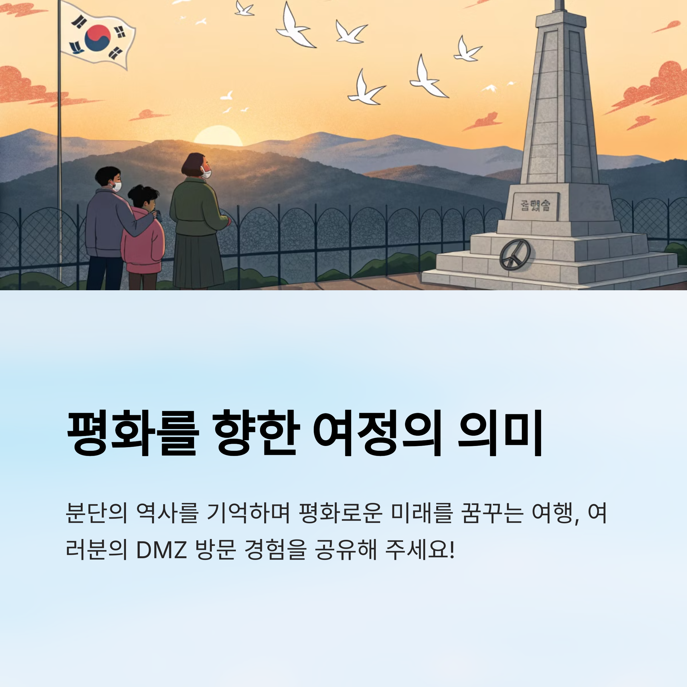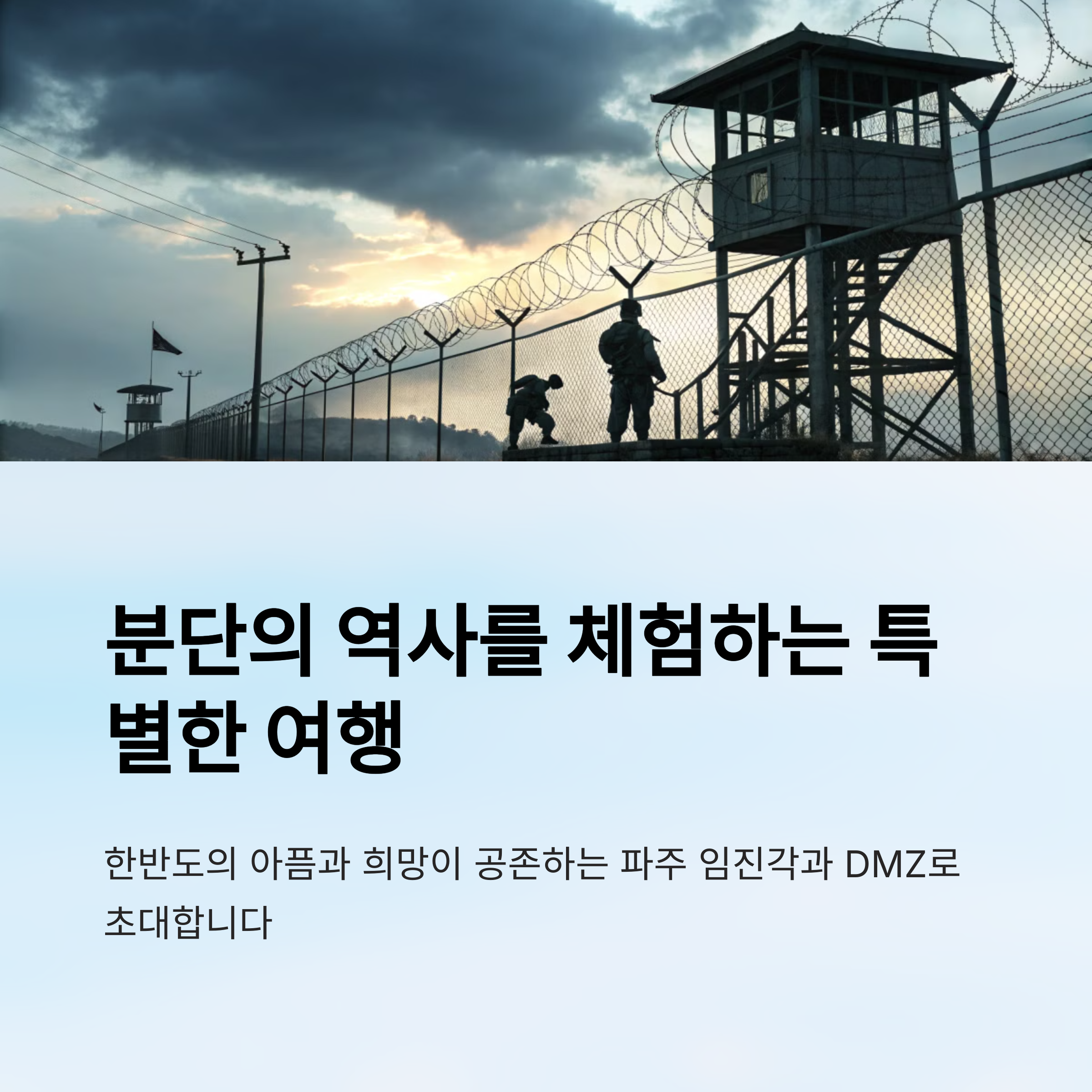 DMZ 투어는 단지 과거를 배우는 자리가 아니라, 지금 우리가 어디에 서 있는지를 돌아보는 시간이에요. 마음속에 오랫동안 남는 특별한 울림을 경험하게 될 거예요.🙇